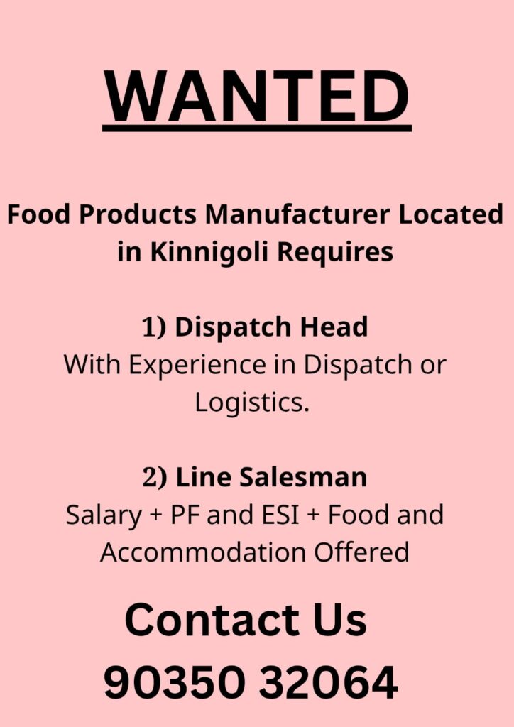 ಕಿನ್ನಿಗೋಳಿಯಲ್ಲಿರುವ ಆಹಾರ ಉತ್ಪನ್ನಗಳ ತಯಾರಿಕ ಘಟಕಕ್ಕೆ ಜನ ಬೇಕಾಗಿದ್ದಾರೆ. 1) Dispatch HeadWith Experience in Dispatch or Logistics. 2) Line SalesmanSalary + PF & ESI + Food and Accommodation Offered ಹೆಚ್ಚಿನ ಮಾಹಿತಿಗಾಗಿ ಸಂಪರ್ಕಿಸಿ: 9035032064