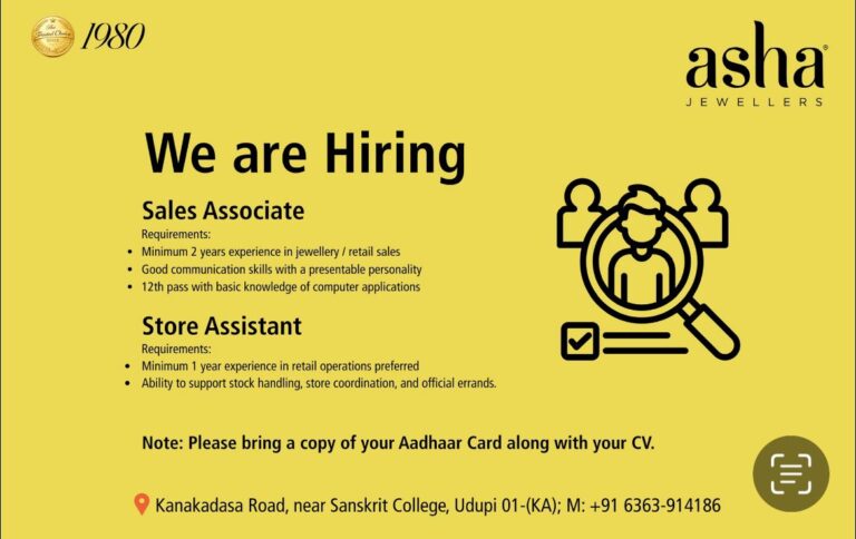 ಉಡುಪಿಯ ಆಶಾ ಜ್ಯುವೆಲ್ಲರ್ಸ್ ನಲ್ಲಿ ಉದ್ಯೋಗಾವಕಾಶ
