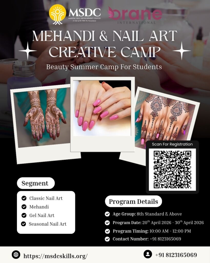 ಮಣಿಪಾಲ MSDC ಯಲ್ಲಿ ಮೆಹೆಂದಿ ಮತ್ತು ನೇಲ್ ಆರ್ಟ್ ಕ್ರಿಯೇಟಿವ್ ಕ್ಯಾಂಪ್, ಆಸಕ್ತಿ ಇದ್ರೆ ಕೂಡಲೇ ಅರ್ಜಿ ಸಲ್ಲಿಸಿ