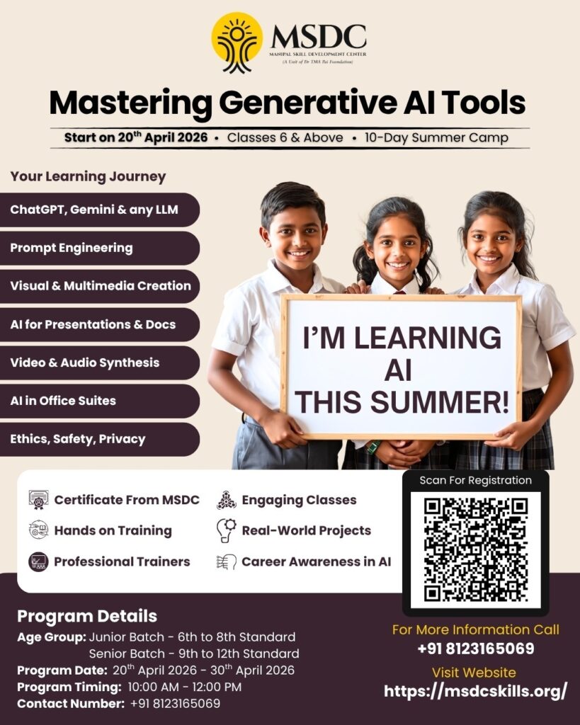 ಮಣಿಪಾಲ: ಮಣಿಪಾಲದ ಎಂಎಸ್ಡಿಸಿ (Manipal Skill Development Center) ವತಿಯಿಂದ ವಿದ್ಯಾರ್ಥಿಗಳಿಗೆ ವಿಶೇಷವಾದ “Mastering Generative AI Tools” ಎಂಬ 10 ದಿನಗಳ ಸಮರ್ ಕ್ಯಾಂಪ್ ನ್ನು ಏ. 20-ಏ 30 ರವರೆಗೆ ಪ್ರತಿದಿನ ಬೆಳಗ್ಗೆ 10ರಿಂದ ಮಧ್ಯಾಹ್ನ 12ರವರೆಗೆ ತರಗತಿಗಳು ನಡೆಯಲಿವೆ. 6ನೇ ತರಗತಿ ಮೇಲ್ಪಟ್ಟ ವಿದ್ಯಾರ್ಥಿಗಳನ್ನು ಗಮನದಲ್ಲಿಟ್ಟುಕೊಂಡು ರೂಪಿಸಲಾದ ಈ ತರಬೇತಿ ಕಾರ್ಯಕ್ರಮದಲ್ಲಿ ChatGPT, Gemini ಸೇರಿದಂತೆ ವಿವಿಧ ಎಐ ಉಪಕರಣಗಳ ಬಳಕೆ, ಪ್ರಾಂಪ್ಟ್ ಎಂಜಿನಿಯರಿಂಗ್, ಮಲ್ಟಿಮೀಡಿಯಾ ಸೃಜನಶೀಲತೆ, ಪ್ರೆಸೆಂಟೇಶನ್ ಮತ್ತು ಡಾಕ್ಯುಮೆಂಟ್ ತಯಾರಿ, […]