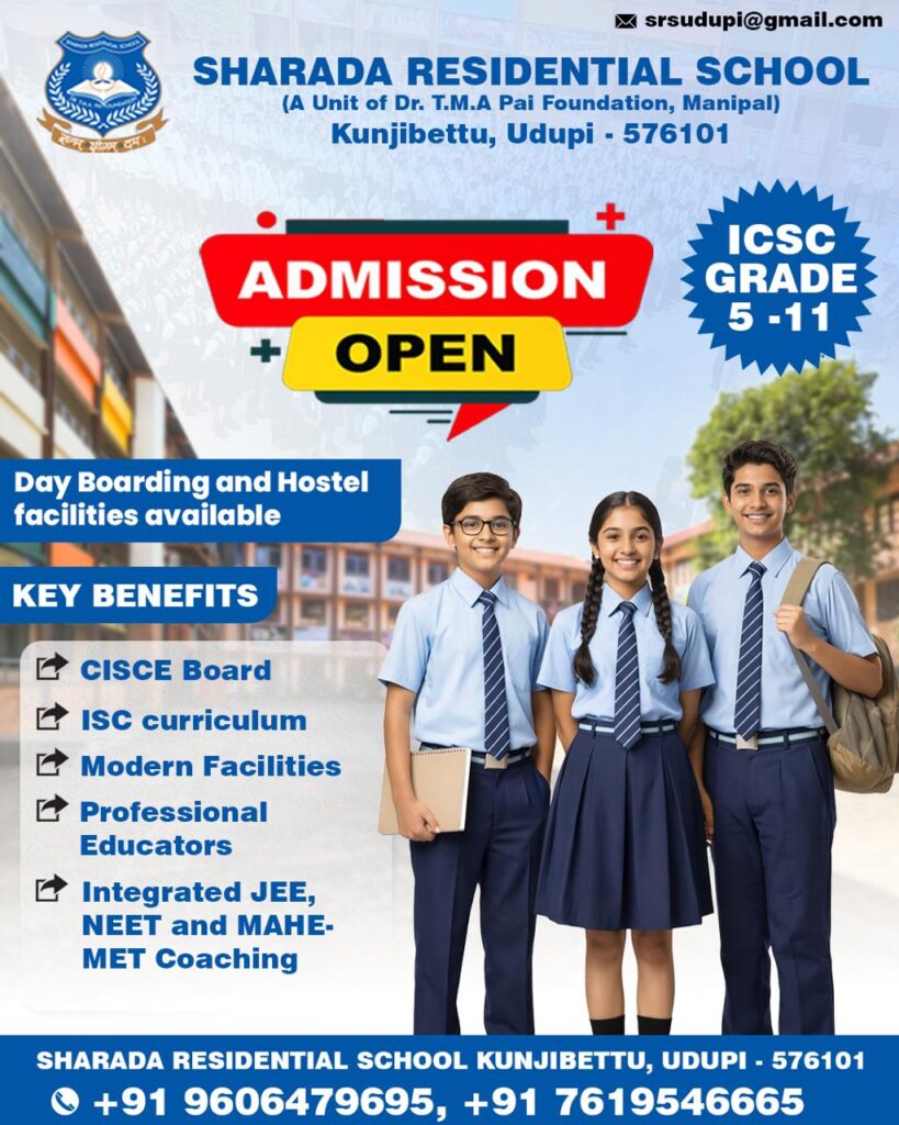 ಉಡುಪಿ: ಕುಂಜಿಬೆಟ್ಟುವಿನ ಶಾರದಾ ರೆಸಿಡೆನ್ಶಿಯಲ್ ಶಾಲೆ Sharada Residential School ಯಲ್ಲಿ 2026-27 ಶೈಕ್ಷಣಿಕ ಸಾಲಿನ ವಿದ್ಯಾರ್ಥಿ ಪ್ರವೇಶ ಪ್ರಕ್ರಿಯೆ ಆರಂಭಗೊಂಡಿದೆ. ಈ ಶಾಲೆ ಡಾ.ಟಿ.ಎಂ.ಎ ಪೈ ಫೌಂಡೇಶನ್ ಘಟಕವಾಗಿ ಕಾರ್ಯನಿರ್ವಹಿಸುತ್ತಿದ್ದು, ಗುಣಮಟ್ಟದ ಶಿಕ್ಷಣಕ್ಕಾಗಿ ಪ್ರಸಿದ್ಧಿಯಾಗಿದೆ. ಶಾಲೆಯಲ್ಲಿ ICSE ಪಠ್ಯಕ್ರಮದ ಅಡಿಯಲ್ಲಿ 5ರಿಂದ 11ನೇ ತರಗತಿವರೆಗಿನ ಪ್ರವೇಶ ಅವಕಾಶ ಲಭ್ಯವಿದೆ. ವಿದ್ಯಾರ್ಥಿಗಳಿಗೆ ದಿನಪಾಠ (Day Boarding) ಹಾಗೂ ವಸತಿ (Hostel) ಸೌಲಭ್ಯಗಳನ್ನು ಒದಗಿಸಲಾಗುತ್ತಿದೆ. ಏನೇನು ಸೌಲಭ್ಯಗಳಿವೆ: CISCE ಮಂಡಳಿ ಪಠ್ಯಕ್ರಮ, ISC ಆಧಾರಿತ ಶಿಕ್ಷಣ ವ್ಯವಸ್ಥೆ, ಆಧುನಿಕ […]