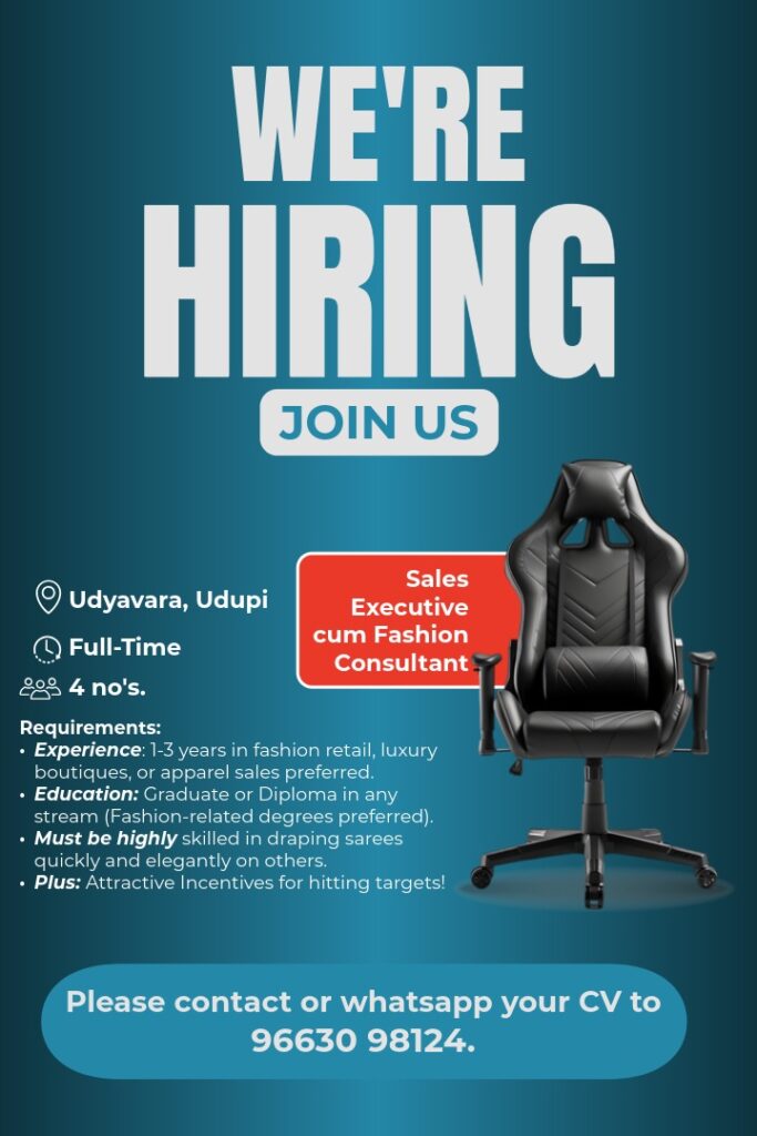 ಉಡುಪಿ: ಉದ್ಯಾವರ ಸಮೀಪದ ಸಂಸ್ಥೆಯೊಂದು ವಿವಿಧ ಹುದ್ದೆಗಳಿಗೆ ನೇಮಕಾತಿ ಪ್ರಕಟಣೆ ಹೊರಡಿಸಿದೆ. ಫ್ಯಾಷನ್ ಕ್ಷೇತ್ರದಲ್ಲಿ ಆಸಕ್ತಿ ಹೊಂದಿರುವ ಅಭ್ಯರ್ಥಿಗಳಿಗೆ ಇದು ಉತ್ತಮ ಉದ್ಯೋಗಾವಕಾಶವಾಗಿದೆ. ಸೆಲ್ಸ್ ಎಕ್ಸಿಕ್ಯೂಟಿವ್ ಕಮ್ ಫ್ಯಾಷನ್ ಕನ್ಸಲ್ಟೆಂಟ್ ಹುದ್ದೆಗೆ ಒಟ್ಟು 4 ಅಭ್ಯರ್ಥಿಗಳನ್ನು ಪೂರ್ಣಕಾಲಿಕವಾಗಿ ನೇಮಕ ಮಾಡಿಕೊಳ್ಳಲಾಗುತ್ತದೆ. ಅರ್ಜಿ ಸಲ್ಲಿಸುವ ಅಭ್ಯರ್ಥಿಗಳಿಗೆ 1 ರಿಂದ 3 ವರ್ಷಗಳವರೆಗೆ ಫ್ಯಾಷನ್ ರಿಟೇಲ್, ಲಕ್ಸುರಿ ಬೂಟಿಕ್ ಅಥವಾ ಅಪರಲ್ ಮಾರಾಟ ಕ್ಷೇತ್ರದಲ್ಲಿ ಅನುಭವ ಇರಬೇಕು ಎಂದು ಸೂಚಿಸಲಾಗಿದೆ. ಯಾವುದೇ ವಿಭಾಗದಲ್ಲಿ ಪದವಿ ಅಥವಾ ಡಿಪ್ಲೊಮಾ ಹೊಂದಿರುವವರು ಅರ್ಹರಾಗಿದ್ದು, […]