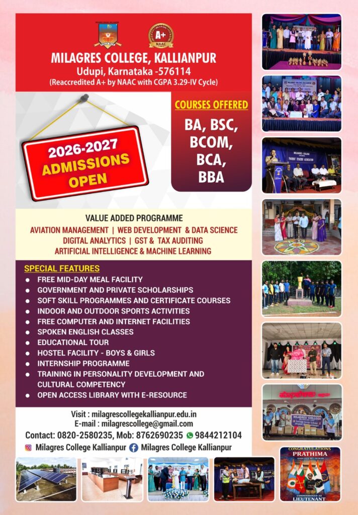 ಉಡುಪಿ:ಕಲ್ಯಾಣಪುರ ಮಿಲಾಗ್ರೆಸ್ ಕಾಲೇಜು 2026-27 ಶೈಕ್ಷಣಿಕ ಸಾಲಿನ ವಿದ್ಯಾರ್ಥಿ ಪ್ರವೇಶ ಪ್ರಕ್ರಿಯೆ ಆರಂಭಗೊಂಡಿದೆ. COURSES OFFERED BA,BSC BCOM, BCA, BBAಈ ಸಂಸ್ಥೆ ಉತ್ತಮ ಗುಣಮಟ್ಟ ಶಿಕ್ಷಣಕ್ಕಾಗಿ ಪ್ರಸಿದ್ಧಿಯಾಗಿದೆ.ಪ್ರವೇಶಾತಿ ಪ್ರಕ್ರಿಯೆ ಆರಂಭಗೊಳಲಿದೆ…… VISIT; milagrescollegekallianpur.edu.in E-mail:[email protected] Contact; 0820-2580235, Mob:8762690235 WatsApp:9844212104.