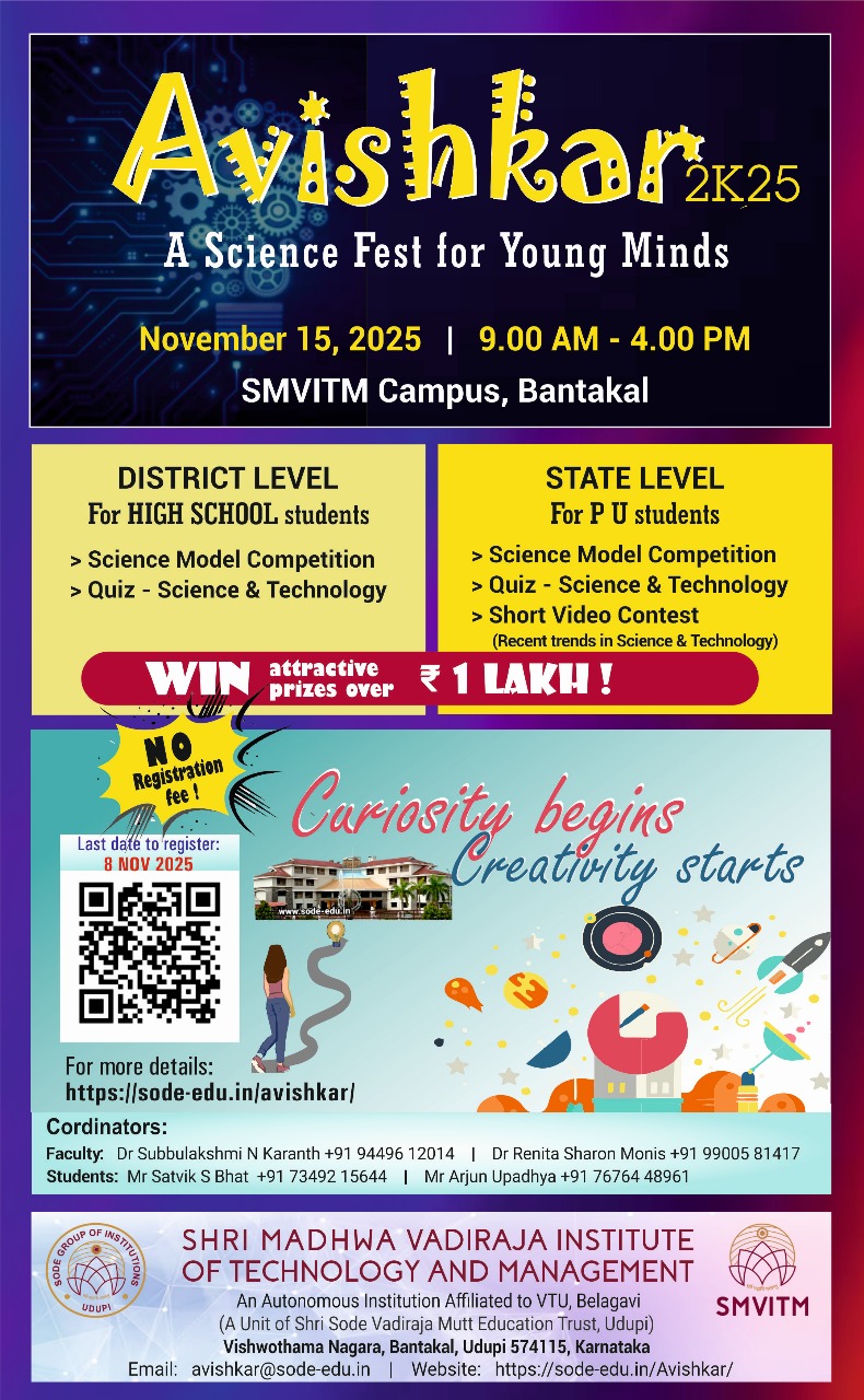 ಆಲೋಚನೆಗಳನ್ನು ಉತ್ತೇಜಿಸಲು ಆವಿಷ್ಕಾರ 2025 ರಾಜ್ಯಮಟ್ಟದ ವಿಜ್ಞಾನ ಮತ್ತು ತಂತ್ರಜ್ಞಾನ ಸ್ಪರ್ಧೆಯನ್ನು ದಿನಾಂಕ 15 ನವೆಂಬರ್ 2025 ರಂದು ಆಯೋಜಿಸಲಾಗಿದೆ.