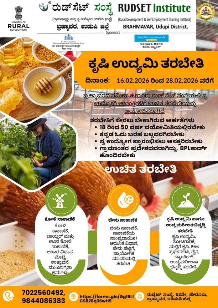 ಬ್ರಹ್ಮಾವರ:ಬ್ರಹ್ಮಾವರ ಸಮೀಪ ಹೇರೂರು ರುಡ್ ಸೆಟ್ ಸಂಸ್ಥೆಯಲ್ಲಿ ಸ್ವ ಉದ್ಯೋಗಿ ಆಕಾಂಕ್ಷಿಗಳಿಗೆ ಉಚಿತ ಕೃಷಿ ಉದ್ಯಮಿ ತರಬೇತಿ ಕಾರ್ಯಕ್ರಮವನ್ನು 16-02-2026 ರಿಂದ 28-02-2026 ರವರೆಗೆ ಆಯೋಜಿಸಲಾಗಿದೆ.