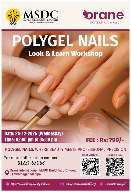ಡಿ.24 ರಂದು ಮಣಿಪಾಲದ MSDC ಒರೇನ್ ಇಂಟರ್ನ್ಯಾಷನಲ್’ನಲ್ಲಿ ‘ಪಾಲಿಜೆಲ್ ನೇಲ್ಸ್’ ಲುಕ್ & ಲರ್ನ್ ಕಾರ್ಯಾಗಾರ: ಒಂದೊಳ್ಳೆ ಕೌಶಲ್ಯ ನಿಮ್ಮದಾಗಿಸಿಕೊಳ್ಳಲು ಇದು ಬೆಸ್ಟ್ ಚಾನ್ಸ್!