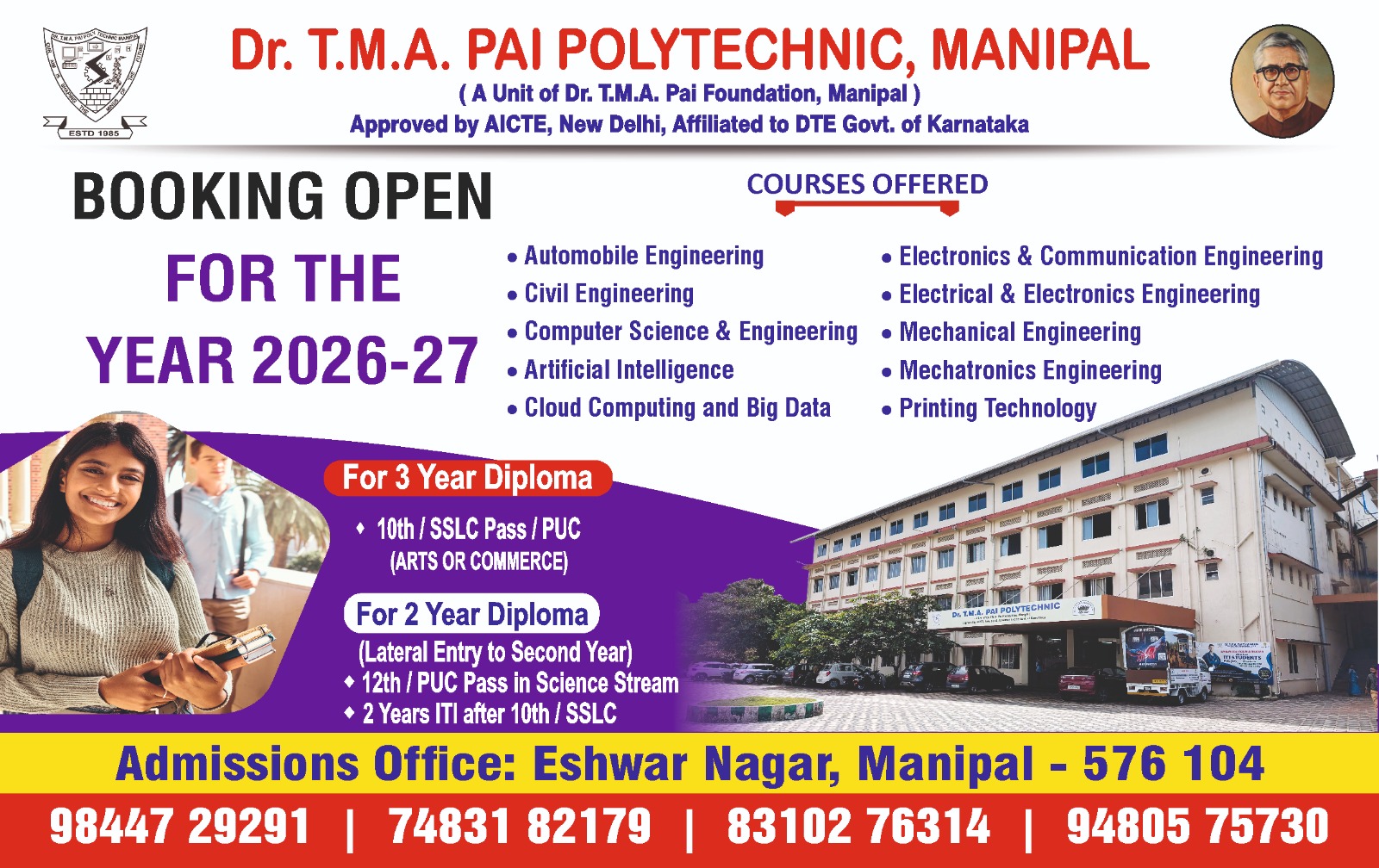 ಮಣಿಪಾಲ: ಡಾ. ಟಿ.ಎಂ.ಎ. ಪೈ ಪಾಲಿಟೆಕ್ನಿಕ್ Dr. T.M.A. Pai Polytechnicನಲ್ಲಿ 2026-27ನೇ ಶೈಕ್ಷಣಿಕ ಸಾಲಿನ ಡಿಪ್ಲೊಮಾ ಕೋರ್ಸ್ಗಳಿಗೆ ಪ್ರವೇಶ ಪ್ರಕ್ರಿಯೆ ಆರಂಭವಾಗಿದೆ.