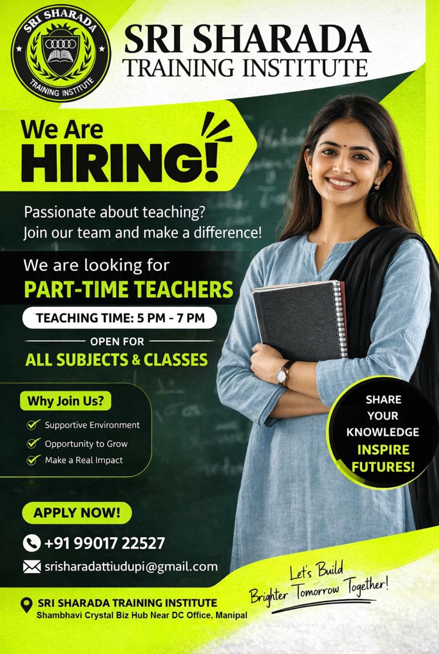 ಆಸಕ್ತರು ಸಂಸ್ಥೆಯಿಂದ ಅರ್ಜಿ ನಮೂನೆ ಪಡೆದು ಶ್ರೀ ಶಾರದಾ ಟೀಚರ್ಸ್ ಟ್ರೈನಿಂಗ್, ಡಿ.ಸಿ.ಆಫೀಸ್ ಬಳಿ, ಕ್ರಿಸ್ಟಲ್ ಬಿಜ್ಹ್ ಹಬ್, 1ನೇ ಮಹಡಿಯಲ್ಲಿರುವ ಸಂಸ್ಥೆಯಲ್ಲಿ (9901722527, [email protected]) ಅರ್ಜಿ ಸಲ್ಲಿಸಬಹುದು ಎಂದು ಸಂಸ್ಥೆಯ ಪ್ರಕಟನೆ ತಿಳಿಸಿರುತ್ತದೆ.