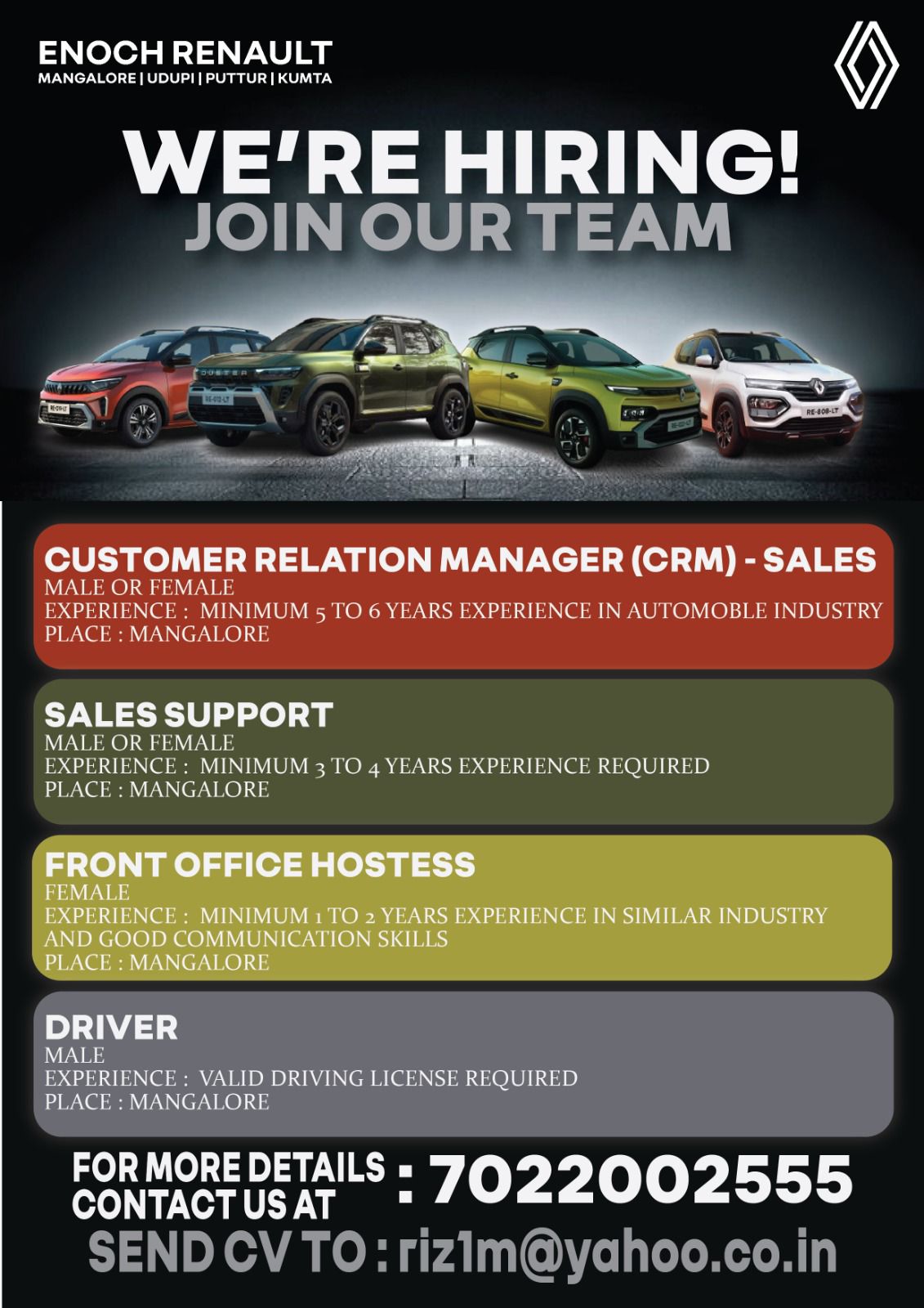 ಎನೊಚ್ ರೆನಾಲ್ಟ್ ಶೋರೂಮ್‌ನಲ್ಲಿ ವಿವಿಧ ಹುದ್ದೆಗಳಿಗೆ ನೇಮಕಾತಿ ನಡೆಯಲಿದೆ. ಆಸಕ್ತಿಯುಳ್ಳ ಅಭ್ಯರ್ಥಿಗಳು ನಮ್ಮ ಶೋರೂಂಗೆ ಭೇಟಿ ನೀಡಬಹುದು