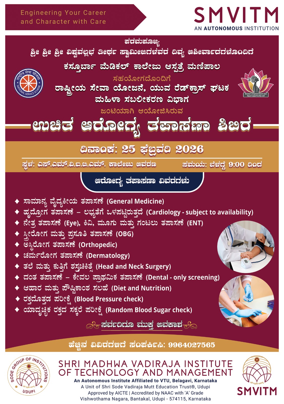 ಉಡುಪಿ, ಬಂಟಕಲ್: ಶ್ರೀ ಮಧ್ವ ವಾದಿರಾಜ ತಾಂತ್ರಿಕ ಮಹಾವಿದ್ಯಾಲಯದ ರಾಷ್ರೀಯ ಸೇವಾ ಯೋಜನೆ ಮತ್ತು ಮಹಿಳಾ ಸಬಲೀಕರಣ ಘಟಕವು ಜಂಟಿಯಾಗಿ ದಿನಾಂಕ 25 ಫೆಬ್ರವರಿ 2026 ರಂದು ಉಚಿತ ಆರೋಗ್ಯ ತಪಾಸಣಾ ಶಿಬಿರವನ್ನು ಆಯೋಜಿಸಿದೆ.