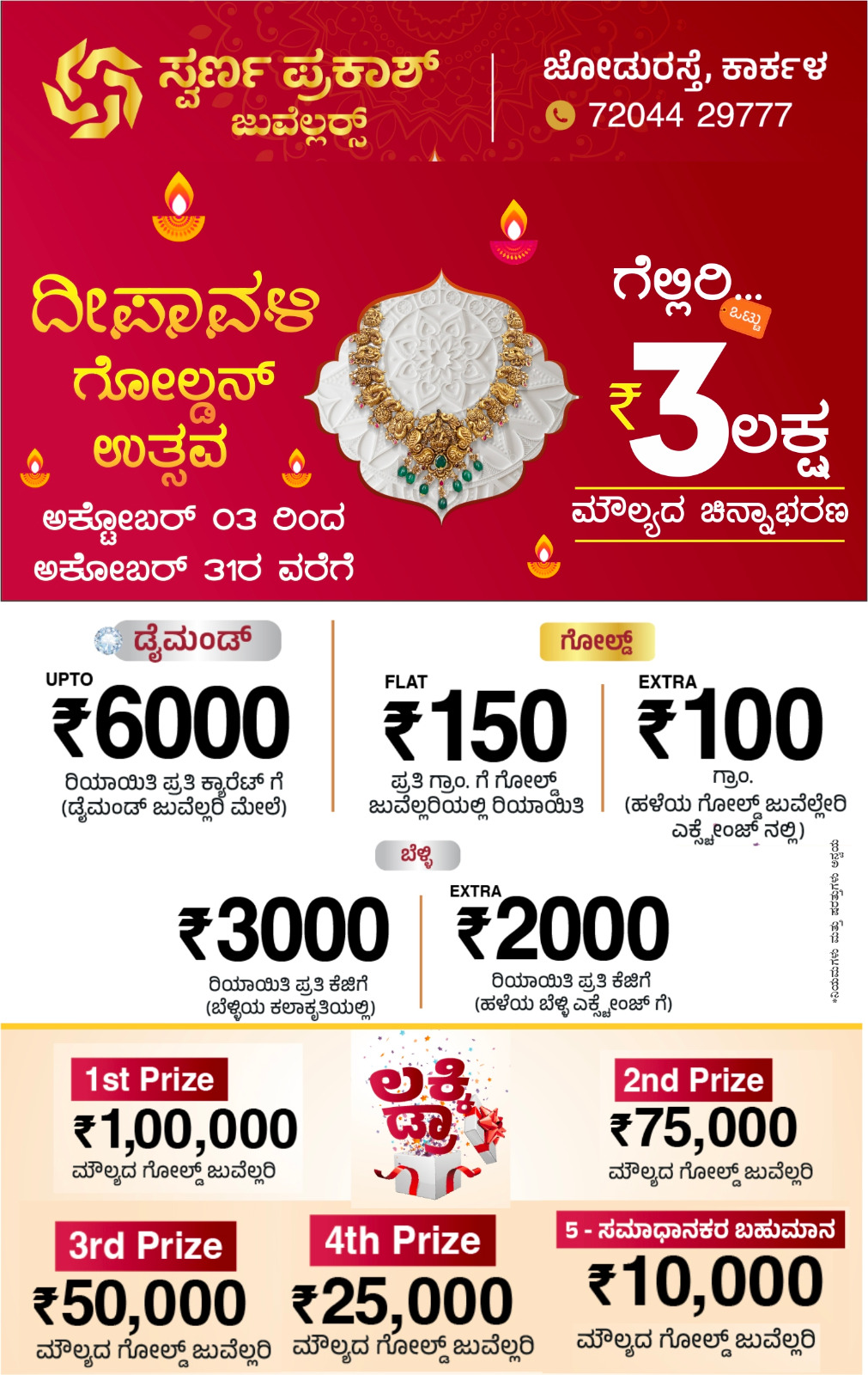 ಕಾರ್ಕಳ: ಕಾರ್ಕಳ ನಗರದ ಜೋಡು ರಸ್ತೆಯ ಸ್ವರ್ಣ ಪ್ರಕಾಶ್ ಜೂವೆಲ್ಲರ್ಸ್ ನಲ್ಲಿ ಅಕ್ಟೋಬರ್ 3ರಿಂದ ಅಕ್ಟೋಬರ್ 31ರ ವರೆಗೆ ದೀಪಾವಳಿ ಗೋಲ್ಡನ್ ಉತ್ಸವ ನಡೆಯಲ್ಲಿದೆ.