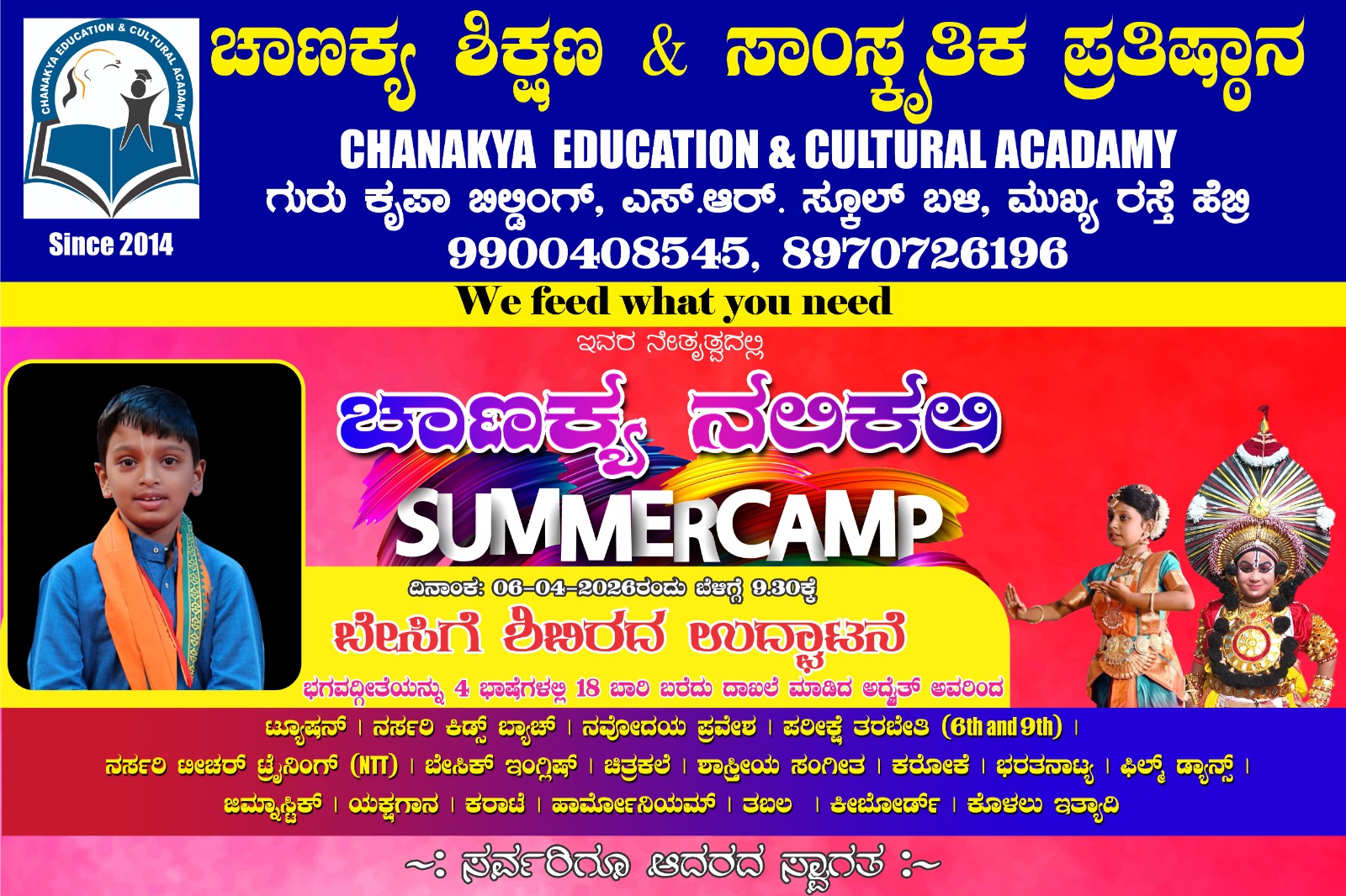 ಹೆಬ್ರಿ: ಹೆಬ್ರಿ ಎಸ್.ಆರ್.ಸ್ಕೂಲ್ ಬಳಿ ಇರುವ ಚಾಣಕ್ಯ ಶಿಕ್ಷಣ ಮತ್ತು ಸಾಂಸ್ಕೃತಿಕ ಪ್ರತಿಷ್ಠಾನದ ಆಶ್ರಯದಲ್ಲಿ ವಿನೂತನ ತರಬೇತಿ ಹಾಗೂ ವೈವಿಧ್ಯಮಯ ಮನರಂಜನೆ ಮೂಲಕ ಉಡುಪಿ ಜಿಲ್ಲೆ ಮಾತ್ರವಲ್ಲದೆ ದೂರದ ವಿದ್ಯಾರ್ಥಿಗಳ ಮನಗೆದ್ದಿರುವ 11ನೇ ವರ್ಷದ ಚಾಣಕ್ಯ ನಲಿಕಲಿ ವೈವಿಧ್ಯಮಯ ಬೇಸಗೆ ಶಿಬಿರ ಏ.6ರಿಂದ 19ರ ವರೆಗೆ ಬೆಳಿಗ್ಗೆ 9.30 ರಿಂದ ಸಂಜೆ 4:30ರ ತನಕ ಎಸ್ ಆರ್ ಬಳಿ ಇರುವ ಚಾಣಕ್ಯ ಸಂಸ್ಥೆಯ ಸಭಾಂಗಣದಲ್ಲಿ ನಡೆಯಲಿದೆ.