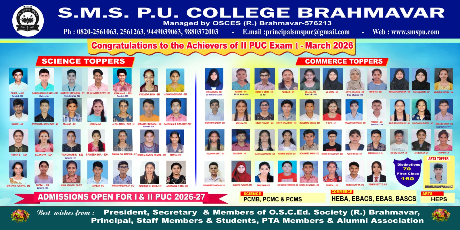 ಬ್ರಹ್ಮಾವರ: ಪದವಿ ಪೂರ್ವ ಶಿಕ್ಷಣ ಇಲಾಖೆ ನಡೆಸಿದ ದ್ವಿತೀಯ ಪಿಯುಸಿ ಪರೀಕ್ಷೆಯಲ್ಲಿ ಎಸ.ಎಂ.ಎಸ್. ಕಾಲೇಜ್, ಬ್ರಮ್ಹಾವರ ಇಲ್ಲಿನ ವಿದ್ಯಾರ್ಥಿಗಳು ವಿಶಿಷ್ಟ ಸಾಧನೆ ಮಾಡಿದ್ದು, ಒಟ್ಟು 70 ವಿದ್ಯಾರ್ಥಿಗಳು ಡಿಸ್ಟಿಂಕ್ಷನ್ ಮತ್ತು 160 ವಿದ್ಯಾರ್ಥಿಗಳು ಫಸ್ಟ್ ಕ್ಲಾಸ್ನಲ್ಲಿ ಉತ್ತೀರ್ಣರಾಗಿದ್ದಾರೆ ಎಂದು ಕಾಲೇಜು ಆಡಳಿತ ಮಂಡಳಿ ತಿಳಿಸಿದೆ.