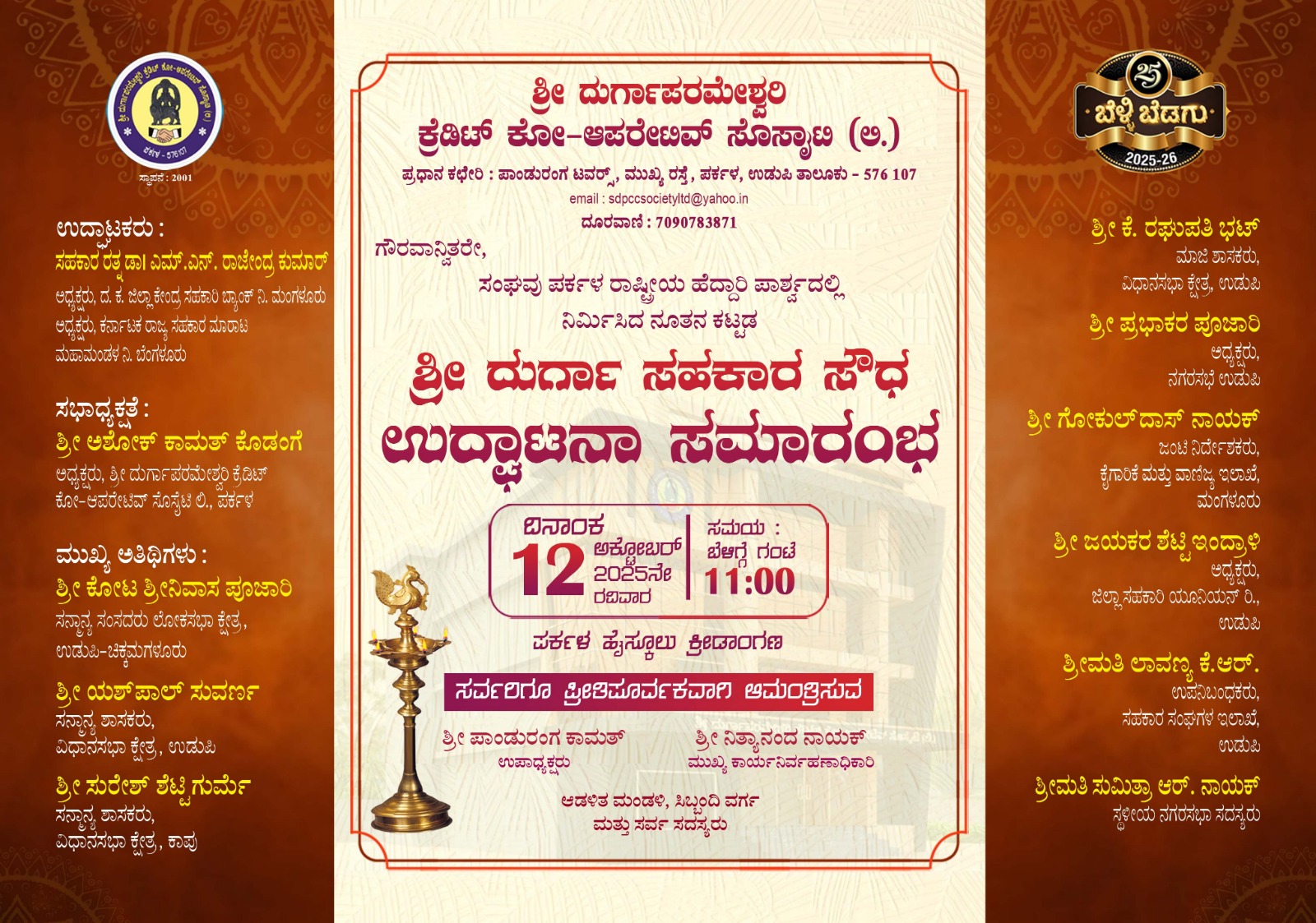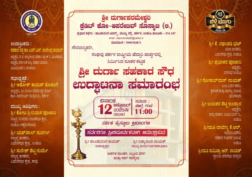 ಪರ್ಕಳ: ಪರ್ಕಳದ ಶ್ರೀ ದುರ್ಗಾಪರಮೇಶ್ವರಿ ಕ್ರೆಡಿಟ್ ಕೋ-ಆಪರೇಟಿವ್ ಸೊಸೈಟಿ (ಲಿ.) ಸಂಘವು ಪರ್ಕಳ ರಾಷ್ಟ್ರೀಯ ಹೆದ್ದಾರಿ ಪಾರ್ಶ್ವದಲ್ಲಿ ನಿರ್ಮಿಸಿದ ನೂತನ ಕಟ್ಟಡ “ಶ್ರೀ ದುರ್ಗಾ ಸಹಕಾರ ಸೌಧ” ಇಂದು (ಅ 12) ಬೆಳಿಗ್ಗೆ 10:30 ಉದ್ಘಾಟನೆ, ನಂತರ ಸಭಾಕಾರ್ಯಕ್ರಮ ಪರ್ಕಳ ಹೈಸ್ಕೂಲು ಕ್ರೀಡಾಂಗಣದಲ್ಲಿ ನಡೆಯಲಿದೆ.