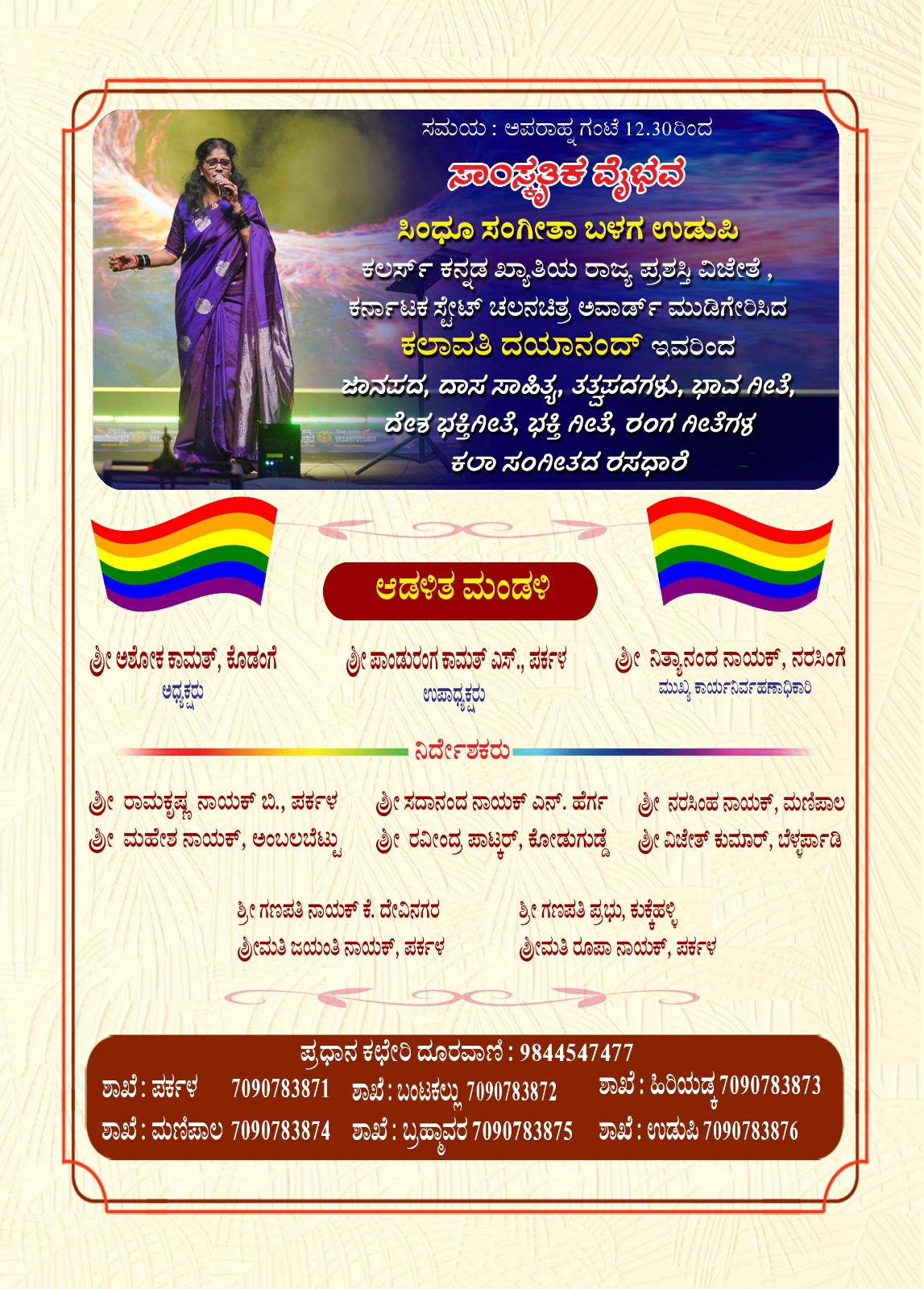 ಇಂದು ಅಪರಾಹ್ನ ಗಂಟೆ 12.30ರಿಂದ ಸಾಂಸ್ಕೃತಿಕ ವೈಭವ ಜರಗಲಿದೆ. ಸಿಂಧೂ ಸಂಗೀತಾ ಬಳಗ ಉಡುಪಿ ಕಲರ್ಸ್ ಕನ್ನಡ ಖ್ಯಾತಿಯ ರಾಜ್ಯ ಪ್ರಶಸ್ತಿ ವಿಜೇತೆ, ಕರ್ನಾಟಕ ಸ್ಟೇಟ್ ಚಲನಚಿತ್ರ ಅವಾರ್ಡ್ ಮುಡಿಗೇರಿಸಿದ ಕಲಾವತಿ ದಯಾನಂದ್ ಇವರಿಂದ ಜಾನಪದ, ದಾಸ ಸಾಹಿತ್ಯ, ತತ್ವಪದಗಳು, ಭಾವ ಗೀತೆ, ದೇಶ ಭಕ್ತಿಗೀತೆ, ಭಕ್ತಿ ಗೀತೆ, ರಂಗ ಗೀತೆಗಳ ಕಲಾ ಸಂಗೀತದ ರಸಧಾರೆ ಕಾರ್ಯಕ್ರಮ ನಡೆಯಲಿದೆ.