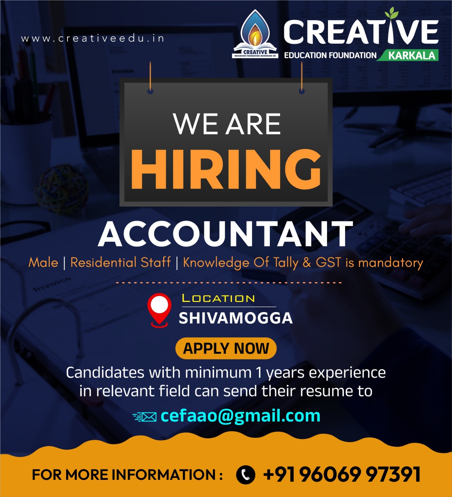 ಕಾರ್ಕಳ: ಕ್ರಿಯೇಟಿವ್ ಎಜುಕೇಶನ್ ಫೌಂಡೇಶನ್, ಕಾರ್ಕಳ ಸಂಸ್ಥೆಯ ಶಿವಮೊಗ್ಗ ಘಟಕದಲ್ಲಿ ಅಕೌಂಟೆಂಟ್ ಹುದ್ದೆಗೆ ಅರ್ಜಿ ಆಹ್ವಾನಿಸಲಾಗಿದೆ.