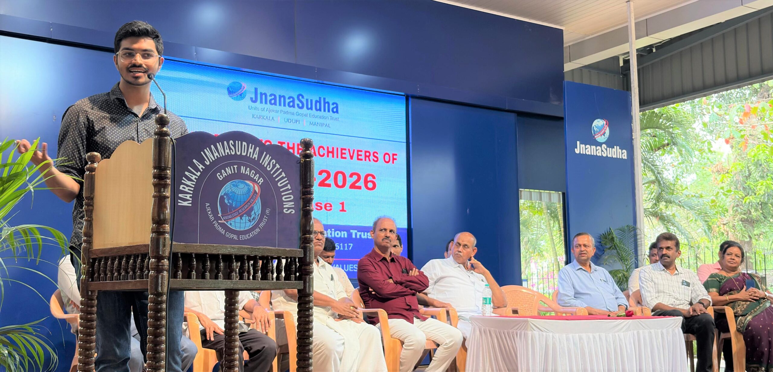 ಅವರು ಕಾರ್ಕಳ ಜ್ಞಾನಸುಧಾದ ಪ್ರಾಂಗಣದಲ್ಲಿ ಜೆಇಇ ಮೈನ್ (ಬಿ.ಟೆಕ್) – 2026 ರ ಮೊದಲ ಹಂತದ ಫಲಿತಾಂಶದಲ್ಲಿ ಕಾಲೇಜಿನ ಸಾಧಕ ವಿದ್ಯಾರ್ಥಿಗಳನ್ನು ಸನ್ಮಾನ ನೆರವೇರಿಸಿ ಮಾತನಾಡಿದರು.