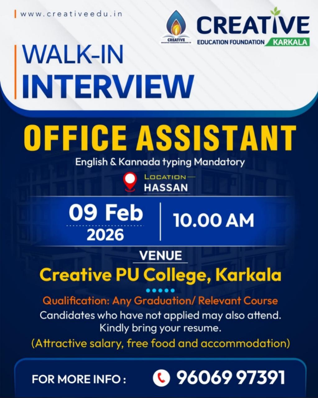 ಕಾರ್ಕಳ:ಕಾರ್ಕಳದ ಕ್ರಿಯೇಟಿವ್ ಎಜುಕೇಶನ್ ಫೌಂಡೇಶನ್ ವತಿಯಿಂದ ಆಫೀಸ್ ಅಸಿಸ್ಟೆಂಟ್ ಹುದ್ದೆಗೆ ನೇಮಕಾತಿ ನಡೆಯಲಿದೆ. ಈ ಹುದ್ದೆಗೆ ಇಂಗ್ಲಿಷ್ ಮತ್ತು ಕನ್ನಡ ಟೈಪಿಂಗ್ ಕಡ್ಡಾಯವಾಗಿದೆ.