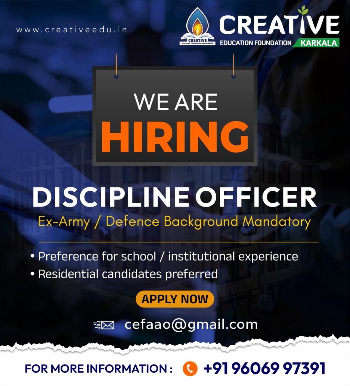 ಕಾರ್ಕಳ:ಕಾರ್ಕಳದ ಕ್ರಿಯೇಟಿವ್ ಎಜುಕೇಶನ್ ಫೌಂಡೇಶನ್ ಸಂಸ್ಥೆಯಲ್ಲಿ ಡಿಸಿಪ್ಲಿನ್ ಆಫೀಸರ್ ಹುದ್ದೆಗೆ ನೇಮಕಾತಿ ನಡೆಯಲಿದೆ.