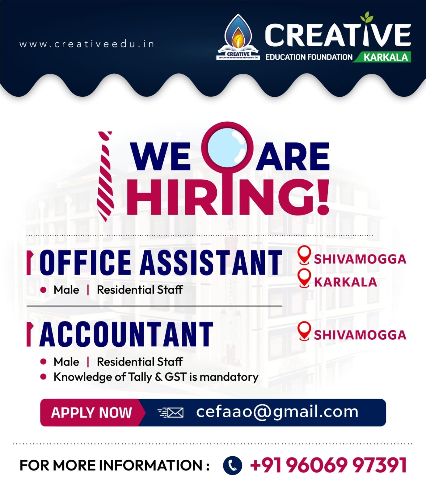 ಕಾರ್ಕಳದ ಕ್ರಿಯೇಟಿವ್ ಎಜುಕೇಶನ್ ಫೌಂಡೇಶನ್ನಲ್ಲಿ ಆಫೀಸ್ ಅಸಿಸ್ಟೆಂಟ್ ಮತ್ತು ಅಕೌಂಟೆಂಟ್ ಹುದ್ದೆಗಳಿಗೆ ಅರ್ಜಿ ಆಹ್ವಾನಿಸಲಾಗಿದೆ.