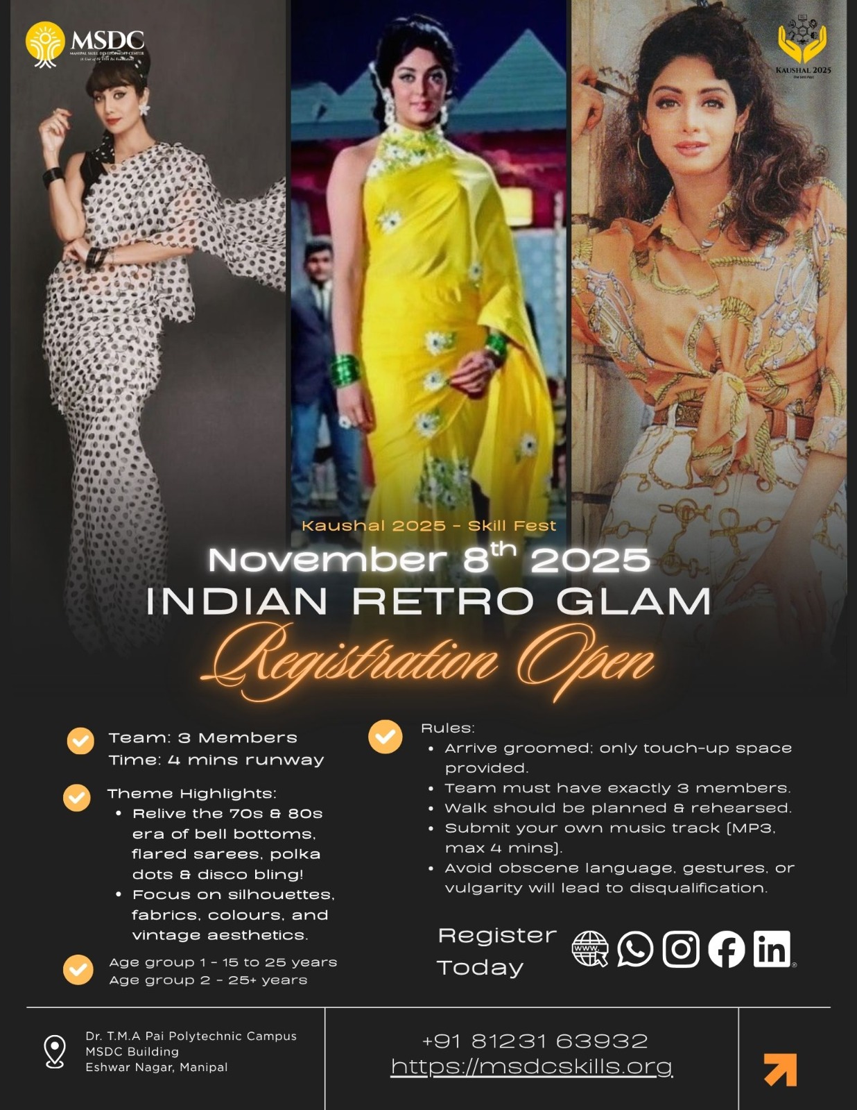 ಮಣಿಪಾಲ: MSDC ಮಣಿಪಾಲ್ ಕೌಶಲ್ಯ ಅಭಿವೃದ್ಧಿ ಕೇಂದ್ರದ ವತಿಯಿಂದ ಕೌಶಲ್ 2025 – ಕೌಶಲ್ಯ ಉತ್ಸವವನ್ನು ಹಮ್ಮಿಕೊಂಡಿದ್ದು ನವೆಂಬರ್ 8 ರಂದು ಭಾರತೀಯ ರೆಟ್ರೋ ಗ್ಲಾಮ್ ಇವೆಂಟ್ ನಡೆಯಲಿದೆ.