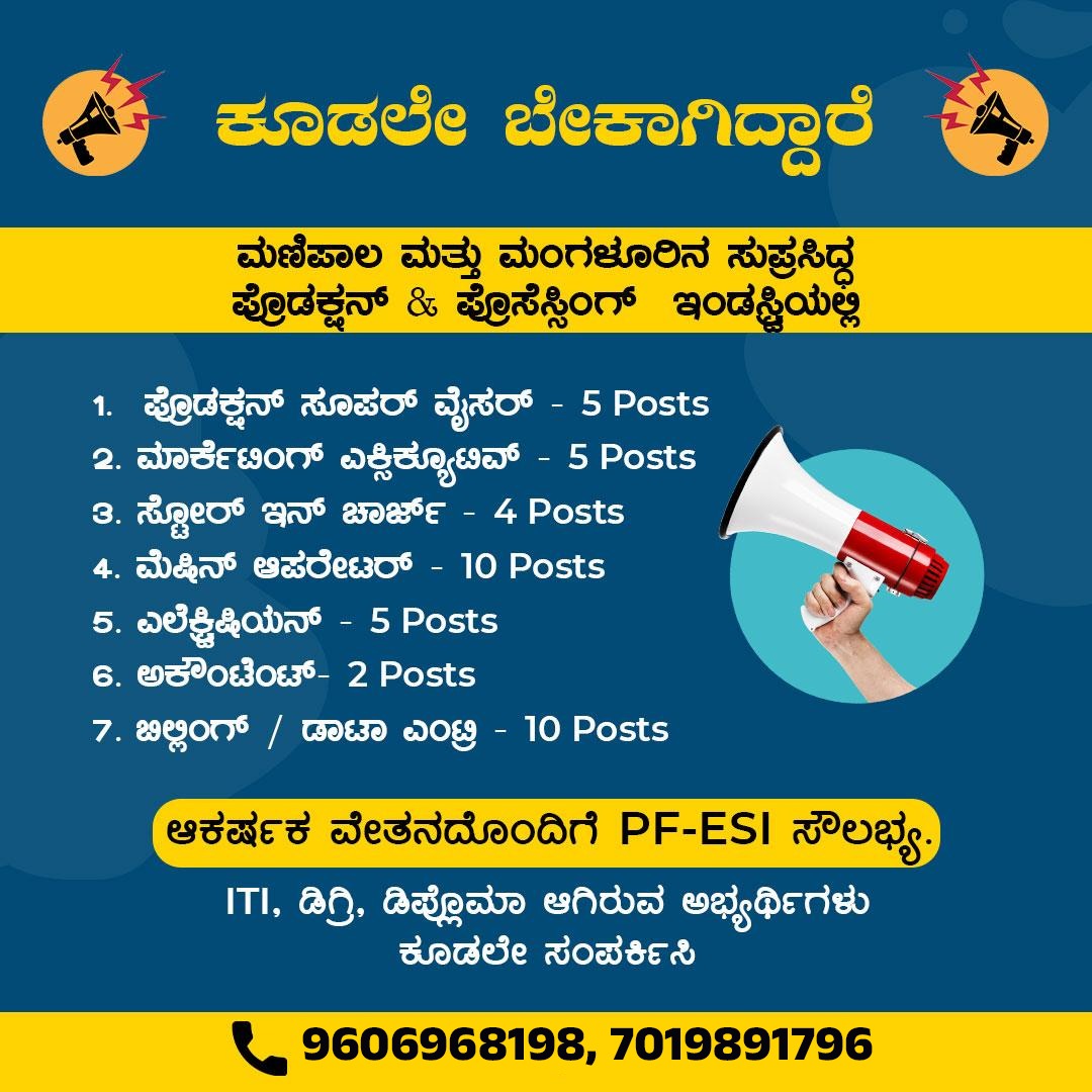 ಉಡುಪಿ:ಮಣಿಪಾಲ- ಮಂಗಳೂರಿನ ಪ್ರಸಿದ್ಧ ಪ್ರೊಡಕ್ಷನ್ ಇಂಡಸ್ಟ್ರಿಯಲ್ಲಿ ಬೇಕಾಗಿದ್ದಾರೆ.