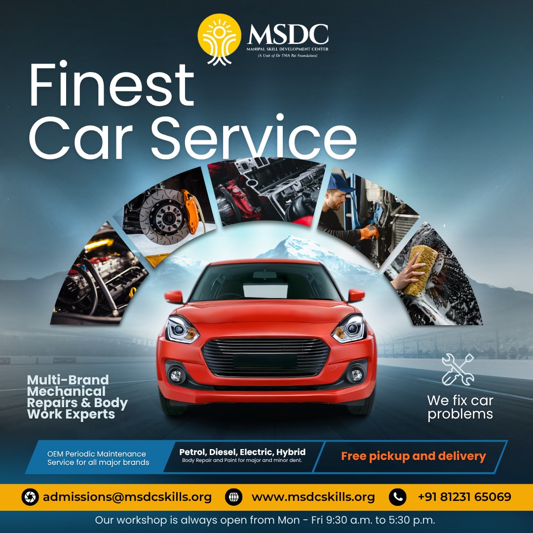 ಮಣಿಪಾಲ: ಮಣಿಪಾಲ್ ಸ್ಕಿಲ್ ಡೆವಲಪ್ಮೆಂಟ್ ಸೆಂಟರ್ (PMA Pai Foundationನ ಘಟಕ)MSDC ಯಿಂದ ಉತ್ತಮ ಕಾರು ಸೇವೆ ಶುರುವಾಗಿದೆ. ಬಹು-ಬ್ರ್ಯಾಂಡ್ ಮೆಕಾನಿಕಲ್ ರಿಪೇರಿ ಹಾಗೂ ಬಾಡಿ ವರ್ಕ್ ತಜ್ಞರು ಇಲ್ಲಿ ಲಭ್ಯರಿದ್ದಾರೆ. ಎಲ್ಲಾ ಪ್ರಮುಖ ಬ್ರ್ಯಾಂಡ್ಗಳಿಗಾಗಿ OEM ನಿಯಮಿತ ಮೆಂಟಿನೆನ್ಸ್ ಸೇವೆ ಇಲ್ಲಿದೆ. ಪೆಟ್ರೋಲ್, ಡೀಸೆಲ್, ಎಲೆಕ್ಟ್ರಿಕ್, ಹೈಬ್ರಿಡ್ ದೊಡ್ಡ ಹಾಗೂ ಸಣ್ಣ ಡೆಂಟ್ಗಳ ಬಾಡಿ ರಿಪೇರಿ ಮತ್ತು ಪೇಂಟ್ ಕೆಲಸ ಎಲ್ಲವೂ ಇಲ್ಲಿ ನಿಮಗೆ ಸಿಗಲಿದೆ.