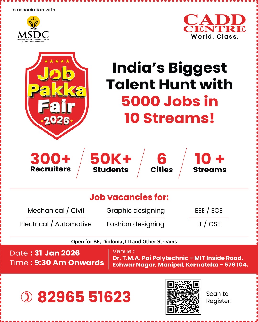 ಮಣಿಪಾಲ: MSDC Manipal Skill Development Center ಸಹಯೋಗದಲ್ಲಿ CADD CENTRE – World Class ಸಹಭಾಗಿತ್ವದಲ್ಲಿ Job Pakka Fair 2026 ಜ. 31 ರಂದು ಬೆಳಿಗ್ಗೆ 9:30 ರಿಂದ ಡಾ. ಟಿ.ಎಂ.ಎ. ಪೈ ಪಾಲಿಟೆಕ್ನಿಕ್ – MIT ಇನ್ಸೈಡ್ ರೋಡ್, ಈಶ್ವರ ನಗರ, ಮಣಿಪಾಲ ಇಲ್ಲಿ ನಡೆಯಲಿದ್ದು ಇದು ಭಾರತದ ಅತಿದೊಡ್ಡ ಟ್ಯಾಲೆಂಟ್ ಹಂಟ್ ಆಗಿದೆ. 10 ಕ್ಷೇತ್ರಗಳಲ್ಲಿ 5000 ಉದ್ಯೋಗಗಳು! 300+ ನೇಮಕಾತಿ ಸಂಸ್ಥೆಗಳು 50K+ ವಿದ್ಯಾರ್ಥಿಗಳು, 6 ನಗರಗಳು, 10+ ಕ್ಷೇತ್ರಗಳು ಈ ಉದ್ಯೋಗ ಮೇಳದಲ್ಲಿರಲಿದೆ.
