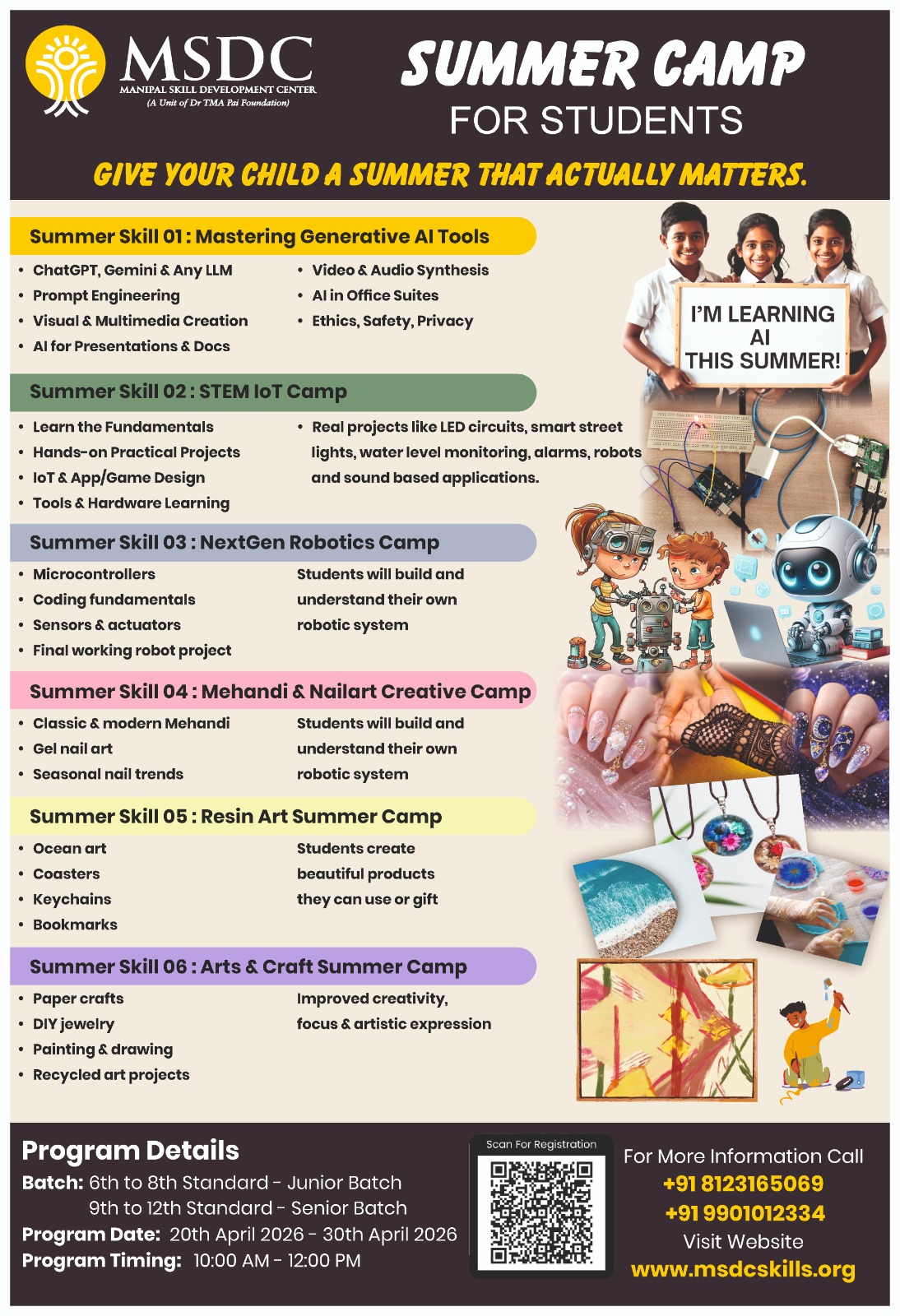 ಮಣಿಪಾಲ: ವಿದ್ಯಾರ್ಥಿಗಳ ಬೇಸಿಗೆ ರಜೆಯನ್ನು ಫಲಪ್ರದವಾಗಿ ಬಳಸುವ ಉದ್ದೇಶದಿಂದ ಮಣಿಪಾಲ ಸ್ಕಿಲ್ ಡೆವಲಪ್ಮೆಂಟ್ ಸೆಂಟರ್ (MSDC) ವತಿಯಿಂದಏಪ್ರಿಲ್ 20ರಿಂದ 30ರವರೆಗೆ ಪ್ರತಿದಿನ ಬೆಳಿಗ್ಗೆ 10ರಿಂದ ಮಧ್ಯಾಹ್ನ 12ರವರೆಗೆ ವಿಶೇಷ ಸಮರ್ ಕ್ಯಾಂಪ್ ಆಯೋಜಿಸಲಾಗಿದೆ. “ನಿಮ್ಮ ಮಕ್ಕಳಿಗೆ ಅರ್ಥಪೂರ್ಣವಾದ ಬೇಸಿಗೆ” ಎಂಬ ಧ್ಯೇಯದೊಂದಿಗೆ ಈ ಕ್ಯಾಂಪ್ನಲ್ಲಿ ವಿವಿಧ ನವೀನ ಮತ್ತು ಸೃಜನಾತ್ಮಕ ತರಬೇತಿಗಳನ್ನು ನೀಡಲಾಗುತ್ತಿದೆ.