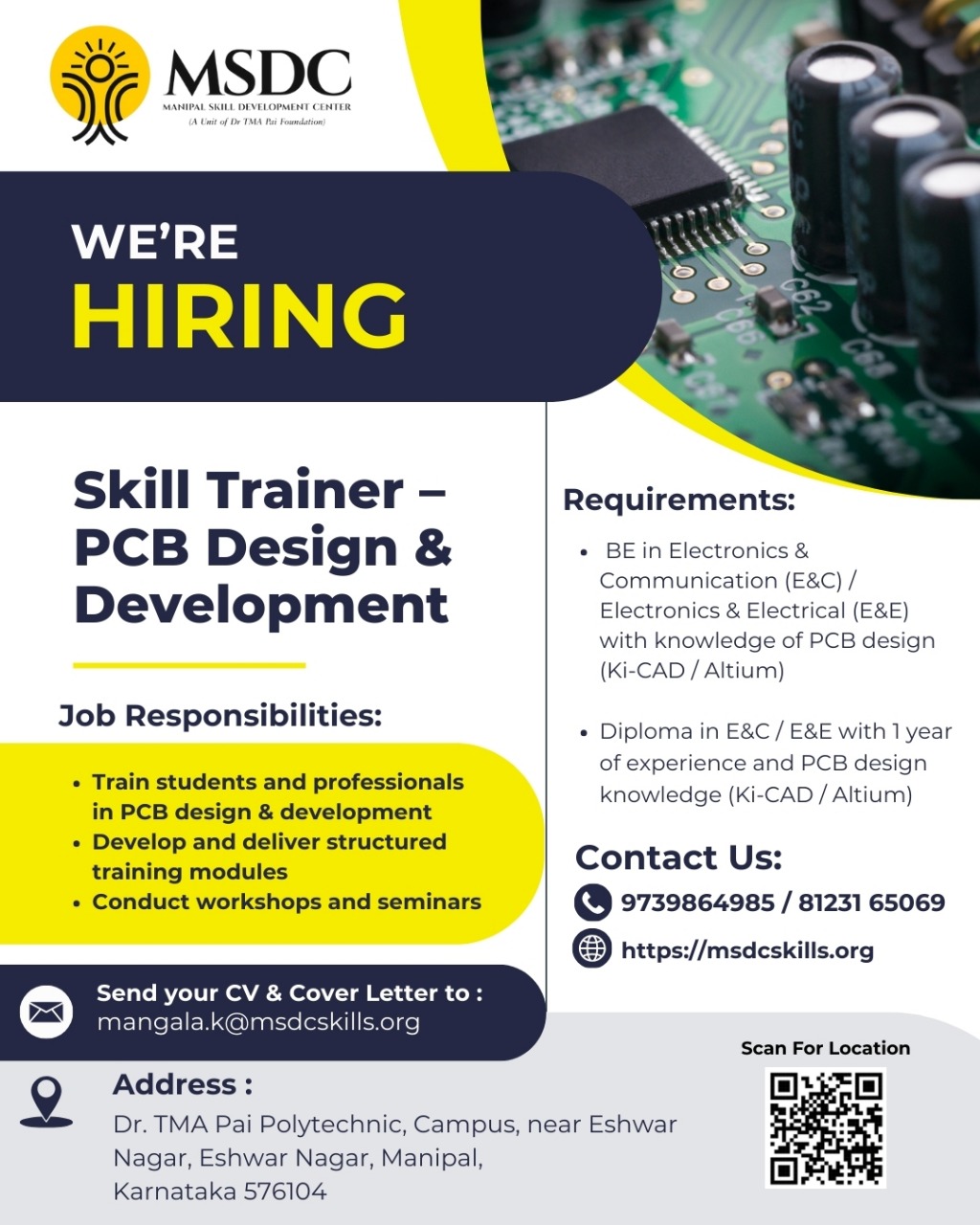 ಮಣಿಪಾಲ: ಮಣಿಪಾಲ್ ಸ್ಕಿಲ್ ಡೆವಲಪ್ಮೆಂಟ್ ಸೆಂಟರ್ ( ಟಿಎಂಎ ಪೈ ಫೌಂಡೇಶನ್’ನ ಒಂದು ಘಟಕ) MSDCಯಲ್ಲಿ ನೇಮಕಾತಿ ನಡೆಯುತ್ತಿದ್ದು ಸ್ಕಿಲ್ ಟ್ರೈನರ್ – PCB ಡಿಸೈನ್ & ಡೆವಲಪ್ಮೆಂಟ್ ಹುದ್ದೆಗಳಿಗಾಗಿ ಅರ್ಜಿಗಳನ್ನು ಆಹ್ವಾನಿಸಲಾಗಿದೆ.