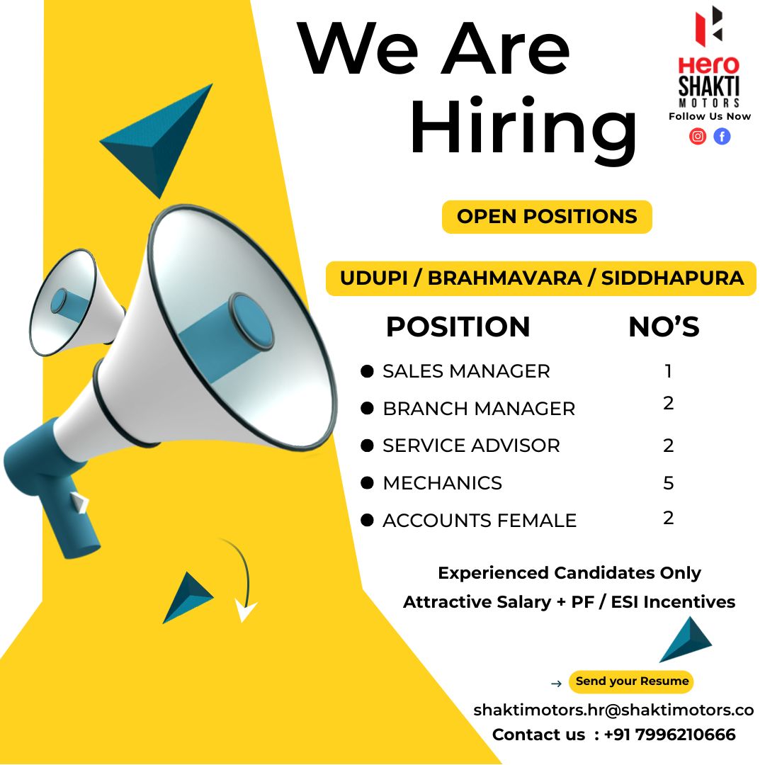 ಉಡುಪಿ:ಉಡುಪಿ,ಬ್ರಹ್ಮಾವರ, ಸಿದ್ಧಾಪುರದ ಹೀರೋ ಶಕ್ತಿ ಮೋಟಾರ್ಸ್ ನಲ್ಲಿ ವಿವಿಧ ಹುದ್ದೆಗಳಿಗೆ ನೇಮಕಾತಿ ನಡೆಯಲಿದೆ.