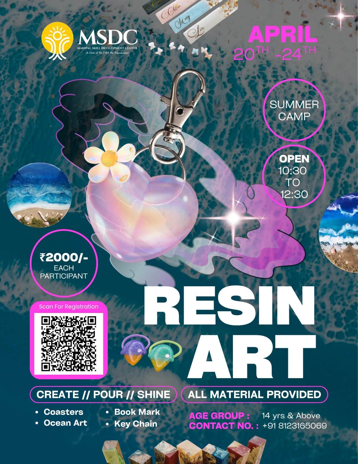 ಉಡುಪಿ: Manipal Skill Development Center ವತಿಯಿಂದ ಏಪ್ರಿಲ್ 20ರಿಂದ 24ರವರೆಗೆ ರೆಸಿನ್ ಆರ್ಟ್ ಸಮರ್ ಕ್ಯಾಂಪ್ನ್ನು ಆಯೋಜಿಸಲಾಗಿದೆ. ಪ್ರತಿದಿನ ಬೆಳಿಗ್ಗೆ 10:30ರಿಂದ ಮಧ್ಯಾಹ್ನ 12:30ರವರೆಗೆ ತರಗತಿಗಳು ನಡೆಯಲಿವೆ.