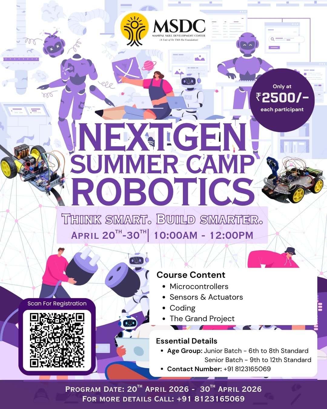 ಮಣಿಪಾಲ: ಮಣಿಪಾಲ ಸ್ಕಿಲ್ ಡೆವಲಪ್ಮೆಂಟ್ ಸೆಂಟರ್ (MSDC) ವತಿಯಿಂದ ವಿದ್ಯಾರ್ಥಿಗಳಿಗಾಗಿ “NextGen Summer Camp – Robotics” ಶಿಬಿರವನ್ನು ಏಪ್ರಿಲ್ 20ರಿಂದ 30ರವರೆಗೆ ಆಯೋಜಿಸಲಾಗಿದೆ.