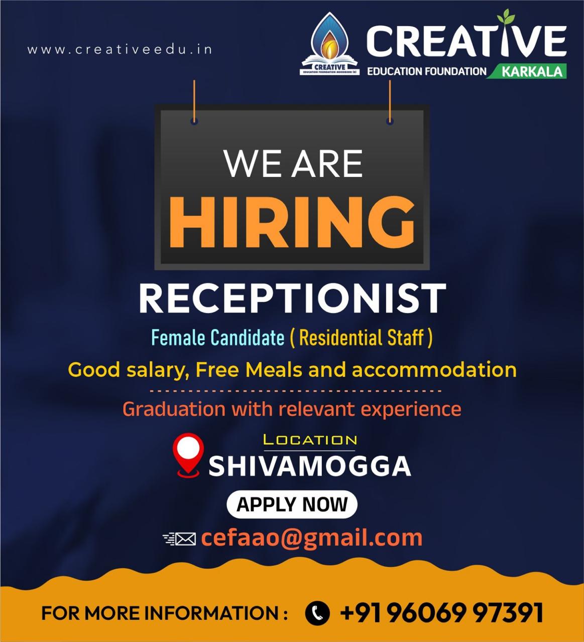 ಕಾರ್ಕಳ:ಕ್ರಿಯೇಟಿವ್ ಎಜುಕೇಶನ್ ಫೌಂಡೇಶನ್ ಕಾರ್ಕಳ ವತಿಯಿಂದ ರಿಸೆಪ್ಷನಿಸ್ಟ್ ಹುದ್ದೆಗೆ ಅರ್ಹ ಅಭ್ಯರ್ಥಿಗಳಿಂದ ಅರ್ಜಿಗಳನ್ನು ಆಹ್ವಾನಿಸಲಾಗಿದೆ.