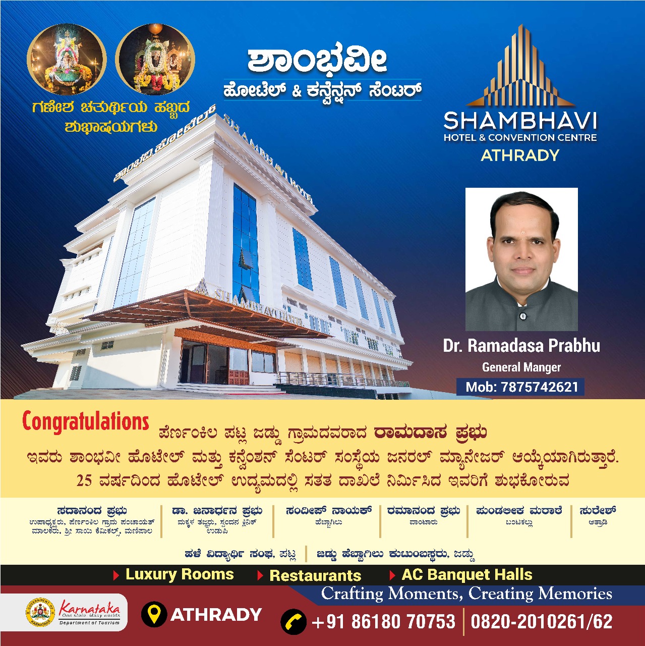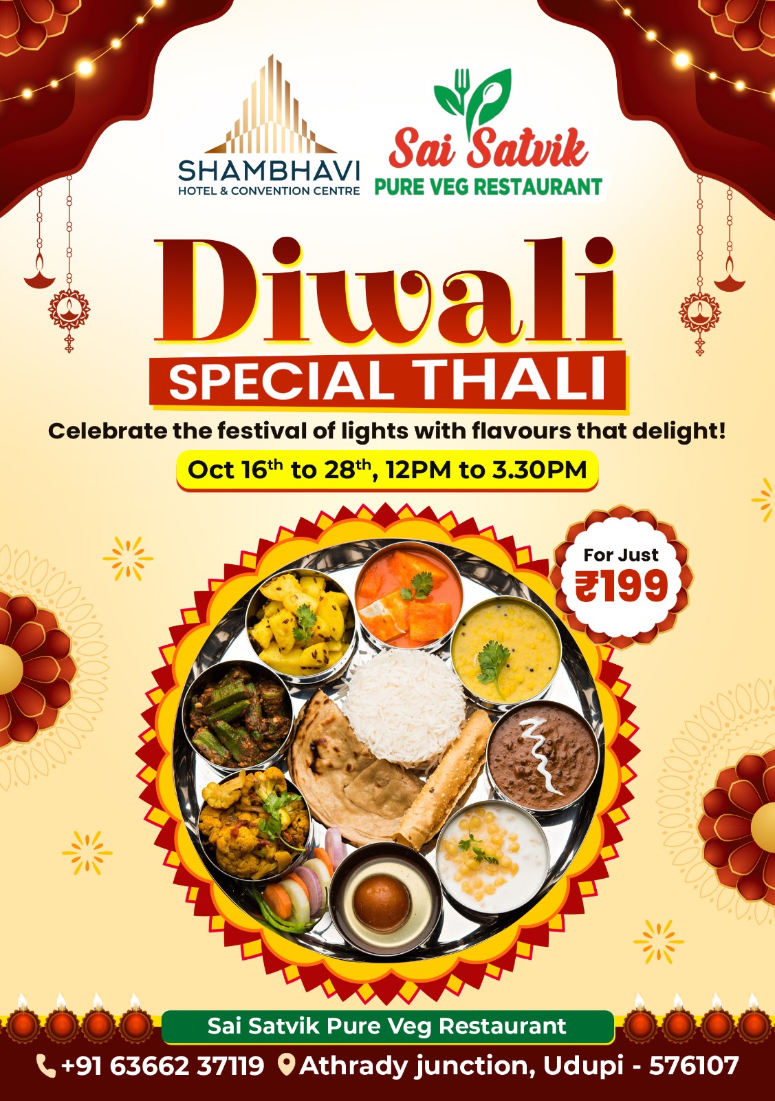 ಈ ದೀಪಾವಳಿಯನ್ನು ಮಧುರ ಥಾಲಿಯೊಂದಿಗೆ ಸಂಭ್ರಮದಿಂದ ಸವಿದುಬಿಡಿ. ಖಂಡಿತ ಆ ರುಚಿ ನಿಮ್ಮ ಬದುಕಿನ ಸುಂದರ ನೆನಪುಗಳಲ್ಲಿ ಒಂದಾಗಲಿದೆ. ಮತ್ತೆ ಮತ್ತೆ ನಿಮ್ಮನ್ನು ಸವಿಯೂಟಕ್ಕೆ ಕರೆಯಲಿದೆ ಅನ್ನೋದ್ರಲ್ಲಿ ಅನುಮಾನವೇ ಬೇಡ. ತಡ ಯಾಕೆ ಈ ದೀಪಾವಳಿಯನ್ನು ಶಾಂಭವಿ ಹೊಟೇಲ್ ಮತ್ತು ಕನ್ವೆಂಷನ್ ಸೆಂಟರ್ ನ ಸಾಯಿ ಸಾತ್ವಿಕ್ ವೆಜ್ ರೆಸ್ಟೊರೆಂಟ್ ನಲ್ಲಿ ಸಂಭ್ರಮಿಸಿ.