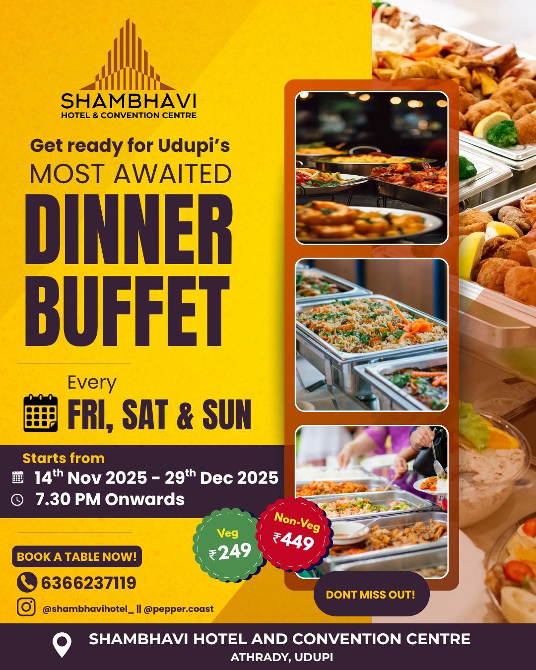 ಉಡುಪಿ: ಆತ್ರಾಡಿಯಲ್ಲಿರುವ ಶಾಂಭವಿ ಹೋಟೆಲ್ & ಕನ್ವೆನ್ಶನ್ ಸೆಂಟರ್ ನಲ್ಲಿ ಇದೇ ನವೆಂಬರ್ 14 ರಿಂದ ಡಿಸೆಂಬರ್ 29 ರವರೆಗೆ ಪ್ರತೀ ದಿನ ಸಂಜೆ 7.30 ರಿಂದ ಶುಕ್ರವಾರ, ಶನಿವಾರ & ಭಾನುವಾರಗಳಲ್ಲಿ ನಿಮಗಾಗಿ ಕಾದಿದೆ ಭರ್ಜರಿ ಡಿನ್ನರ್ ಭಫೇ.
