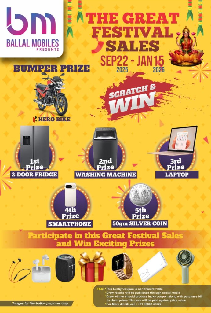 ಬಳ್ಳಾಲ್ ಮೊಬೈಲ್ಸ್ ನ “ದಿ ಗ್ರೇಟ್ ಫೆಸ್ಟಿವಲ್ ಸೇಲ್ಸ್” ನಲ್ಲಿ ಭಾಗವಹಿಸಿದ ಪ್ರತಿ ಗ್ರಾಹಕರಿಗೆ ಖಚಿತ ಉಡುಗೊರೆ ನೀಡುತ್ತಿದೆ. ಹಾಗೂ ಬಲ್ಲಾಳ್ ಮೊಬೈಲ್ಸ್ ನಲ್ಲಿ ಪ್ರತಿ ಮೊಬೈಲ್ ಫೋನ್ ಖರೀದಿಗೆ ಸ್ಕ್ರಾಚ್ ಅಂಡ್ ವಿನ್ ಬಹುಮಾನ ಗೆಲ್ಲಬಹುದಾಗಿದೆ. ಟಿವಿ, ಸ್ಪೀಕರ್, ಸ್ಮಾರ್ಟ್ ವಾಚ್, ಐರನ್ ಬಾಕ್ಸ್, ನೆಕ್ ಬ್ಯಾಂಡ್, ಬ್ಯಾಗ್, ತವ ಸ್ಟಿಕ್ ಹಾಗೂ ಇನ್ನಿತರ ಬಹುಮಾನಗಳು ಒಳಗೊಂಡಿವೆ.