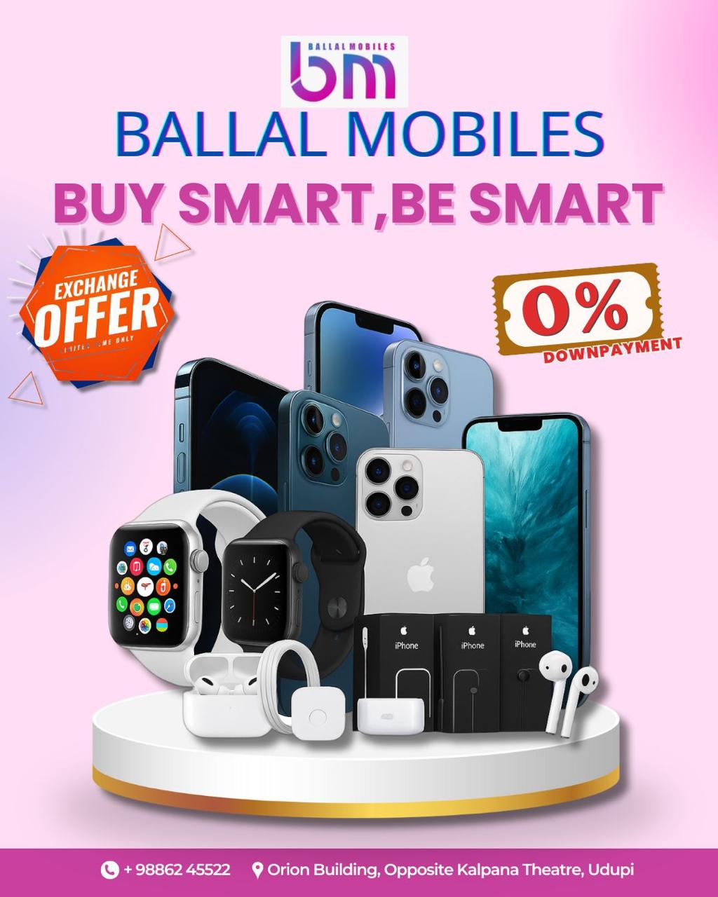 ಬಲ್ಲಾಳ್ ಮೊಬೈಲ್ಸ್’ನಲ್ಲಿ ಐಫೋನ್ 12,13,14, 15, 16 ಮತ್ತು 17ರ ಎಲ್ಲಾ ಸೀರೀಸ್’ ಗಳು, ಮೊಡ್ರೋಲಾ ಓಪೊ, ವಿವೋ, ಒನ್ ಪ್ಲಸ್, ಎಂಐ, ಪೊಕೊ, ನಥಿಂಗ್, ರಿಯಲ್ ಮಿ, ಸ್ಯಾಮ್ಸಂಗ್ ಹಾಗೂ ನೋಕಿಯಾ, ಗೂಗಲ್ ಪಿಕ್ಸೆಲ್ ಎಲ್ಲಾ ರೀತಿಯ ಸ್ಮಾರ್ಟ್ ಫೋನ್ ಗಳು ಇಲ್ಲಿ ಲಭ್ಯವಿದ್ದು, ಸುಲಭವಾಗಿ ಇಎಂಐ ಕಂತುಗಳಲ್ಲಿ ಪಾವತಿಸಬಹುದಾಗಿದೆ. ಖರೀದಿಸಲು ಇಚ್ಛಿಸುವವರು ಬಲ್ಲಾಳ್ ಮೊಬೈಲ್ಸ್ ಗೆ ಭೇಟಿ ನೀಡಬಹುದು.
