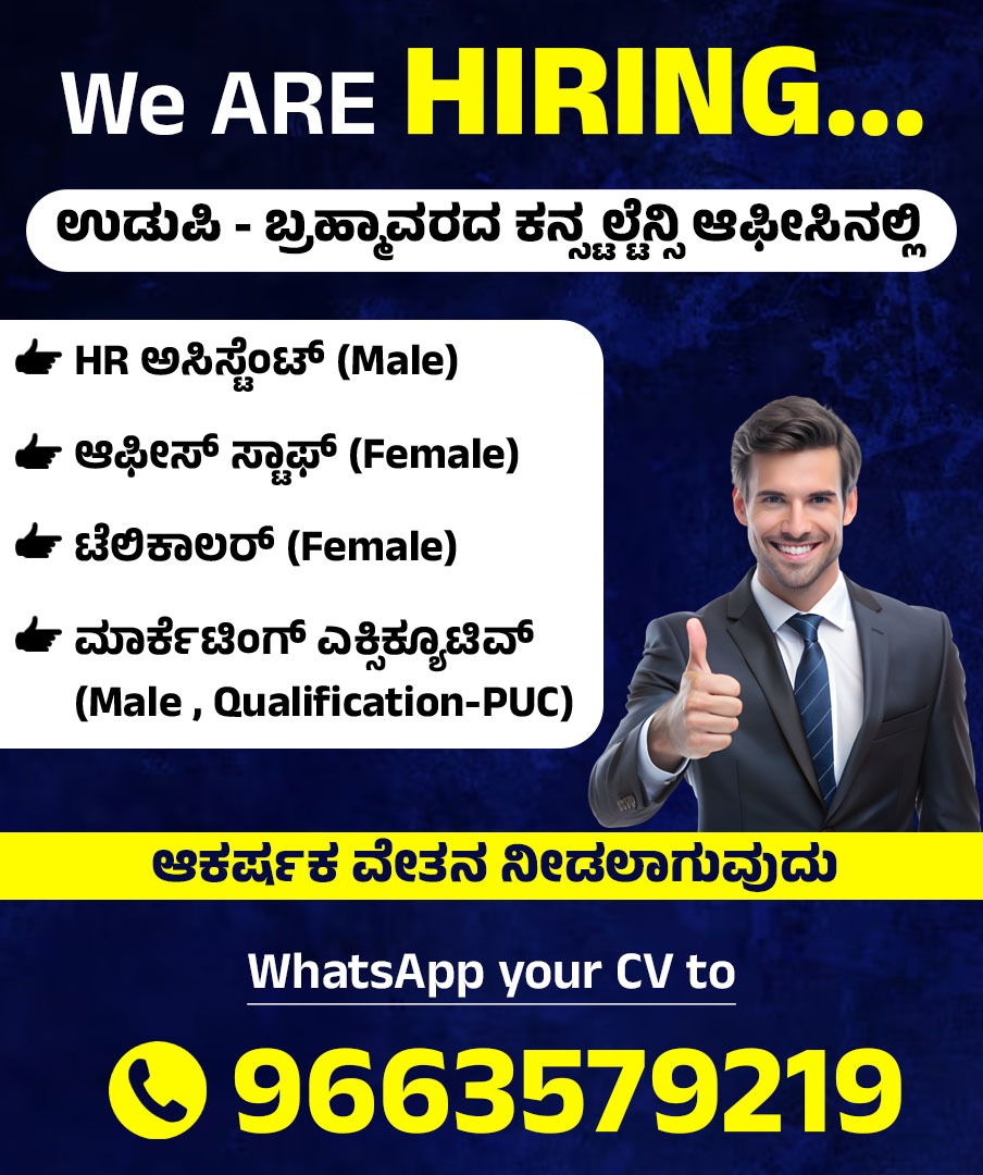 ಉಡುಪಿ:ಉಡುಪಿ – ಬ್ರಹ್ಮಾವರದ ಕನ್ಸಲ್ಟೆನ್ಸಿ ಆಫೀಸಿನಲ್ಲಿ ವಿವಿಧ ಹುದ್ದೆಗಳಿಗೆ ನೇಮಕಾತಿ ನಡೆಯಲಿದೆ.