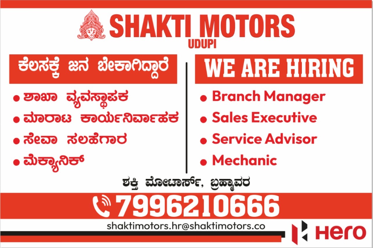 ಉಡುಪಿಯ ಶಕ್ತಿ ಮೋಟಾರ್ಸ್ ನಲ್ಲಿ ಕೆಲಸಕ್ಕೆ ಜನ ಬೇಕಾಗಿದ್ದಾರೆ