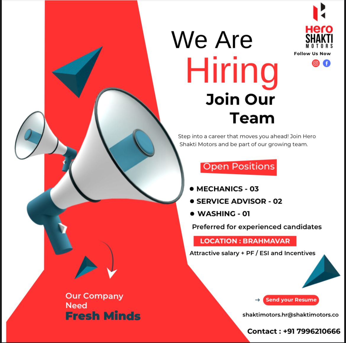 ಬ್ರಹ್ಮಾವರದ ಹೀರೋಶಕ್ತಿ ಮೋಟರ್ಸ್ ನಲ್ಲಿ ವಿವಿಧ ಹುದ್ದೆಗಳಿಗೆ ನೇಮಕಾತಿ