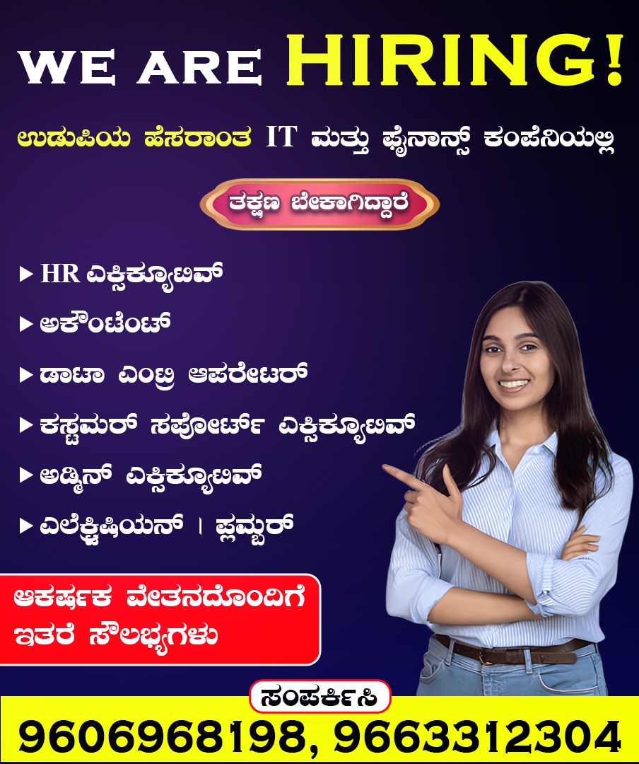 ಉಡುಪಿ:ಉಡುಪಿಯ ಹೆಸರಾಂತ IT ಮತ್ತು ಫೈನಾನ್ಸ್ ಕಂಪೆನಿಯಲ್ಲಿ ವಿವಿಧ ಹುದ್ದೆಗಳಿಗೆ ನೇಮಕಾತಿ ನಡೆಯಲಿದೆ.