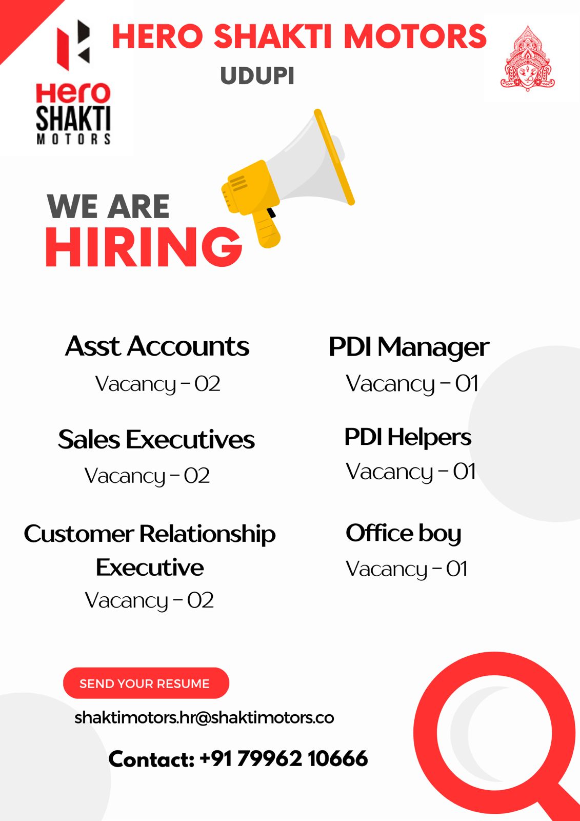 ಉಡುಪಿಯ ಹೀರೋ ಶಕ್ತಿ ಮೋಟಾರ್ಸ್ ನಲ್ಲಿ ವಿವಿಧ ಹುದ್ದೆಗಳಿಗೆ ನೇಮಕಾತಿ