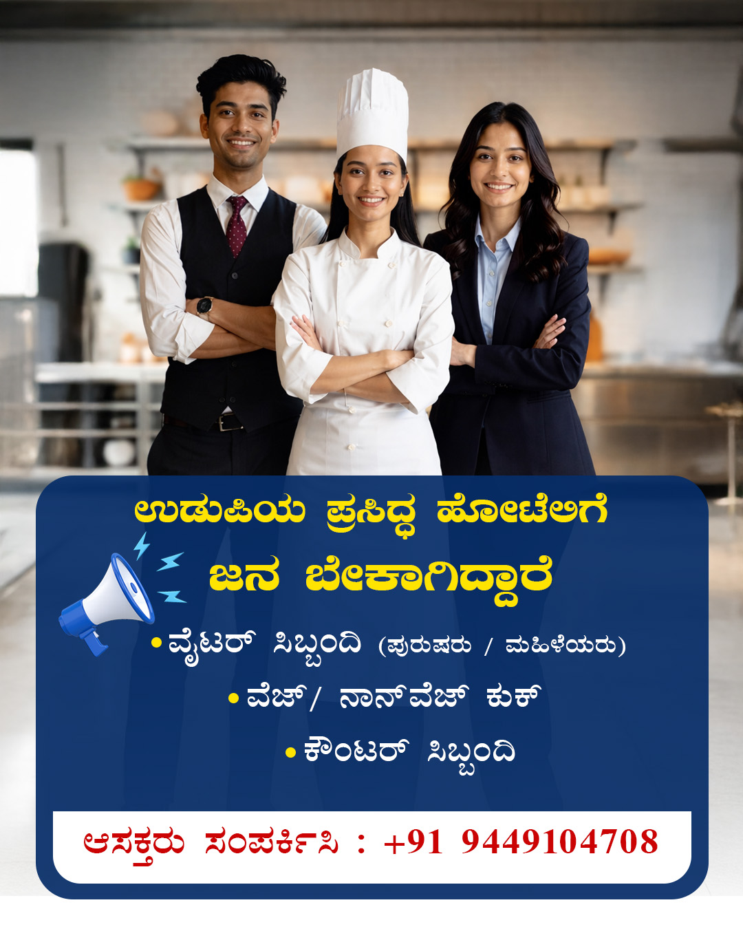 ಉಡುಪಿ:ಉಡುಪಿಯ ಪ್ರತಿಷ್ಠಿತ ಹೋಟೆಲ್ನಲ್ಲಿ ವೈಟರ್ (ಪುರುಷರು/ಮಹಿಳೆಯರು) ವೆಜ್/ನಾನ್ ವೆಜ್ ಕುಕ್, ಹಾಗೂ ಕೌಂಟರ್ ಸಿಬ್ಬಂದಿ ಹುದ್ದೆಗಳಿಗೆ ನೇಮಕಾತಿ ನಡೆಯಲಿದೆ.