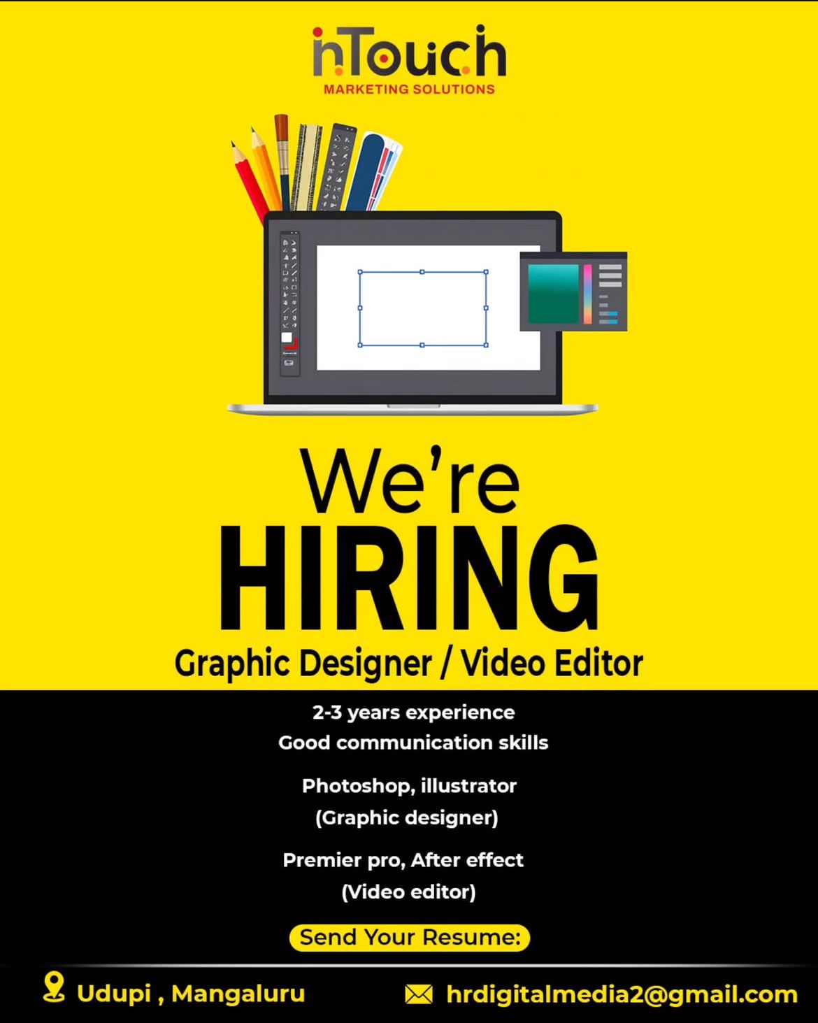 ಉಡುಪಿ:InTouch ಮಾರ್ಕೆಟಿಂಗ್ ಸಲ್ಯೂಷನ್ಸ್ ನಲ್ಲಿ ಗ್ರಾಫಿಕ್ ಡಿಸೈನರ್ / ವಿಡಿಯೋ ಎಡಿಟರ್ ಹುದ್ದೆಗೆ ನೇಮಕಾತಿ ನಡೆಯಲಿದೆ.