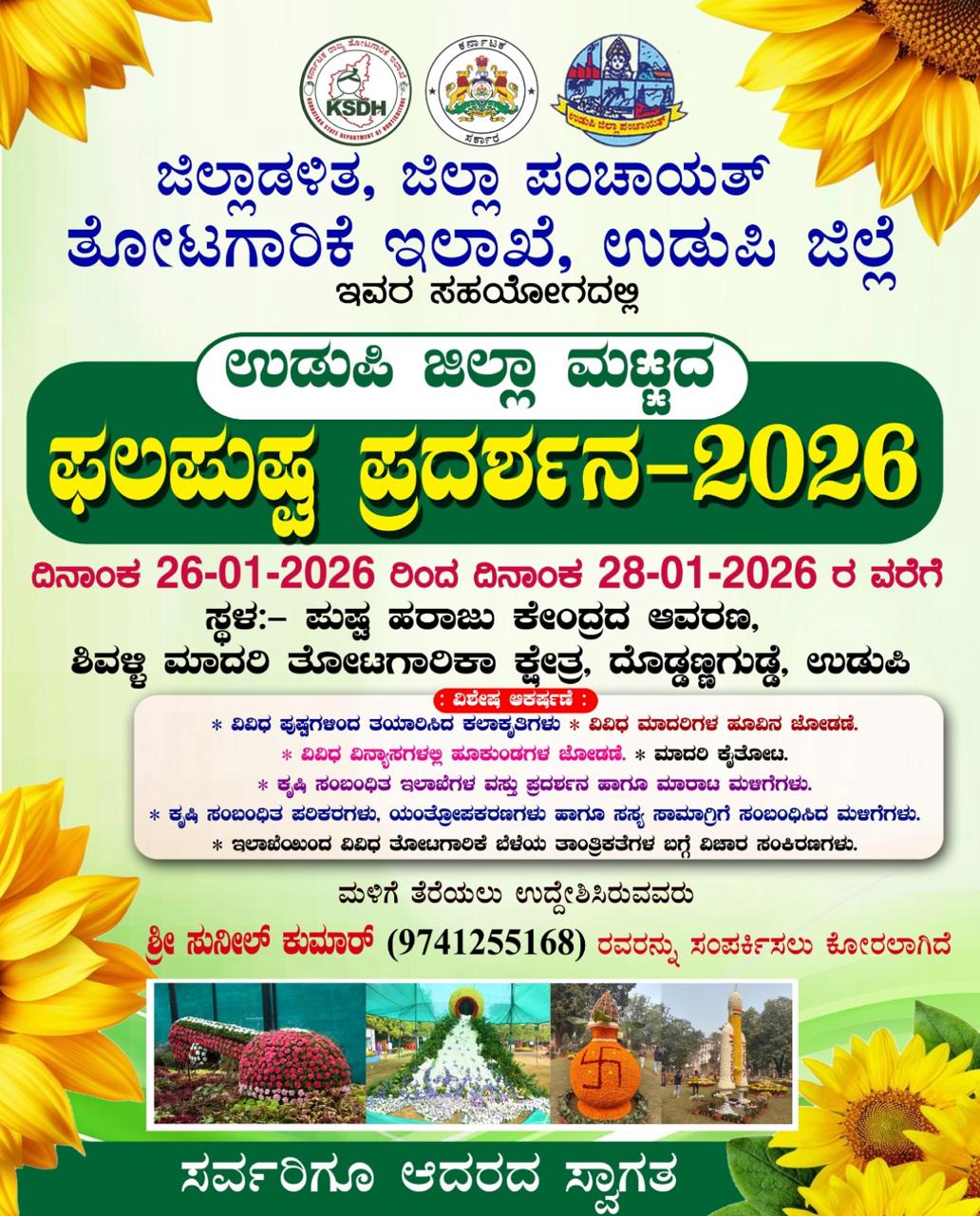 ಉಡುಪಿ:ಜಿಲ್ಲಾಡಳಿತ, ಜಿಲ್ಲಾ ಪಂಚಾಯತ್, ತೋಟಗಾರಿಕೆ ಇಲಾಖೆ ಹಾಗೂ ಉಡುಪಿ ಜಿಲ್ಲಾ ಇವರ ಸಂಯುಕ್ತ ಆಶ್ರಯದಲ್ಲಿ ಉಡುಪಿ ಜಿಲ್ಲಾ ಮಟ್ಟದ ಫಲಪುಷ್ಪ ಪ್ರದರ್ಶನ–2026 ಅನ್ನು ಆಯೋಜಿಸಲಾಗಿದೆ.