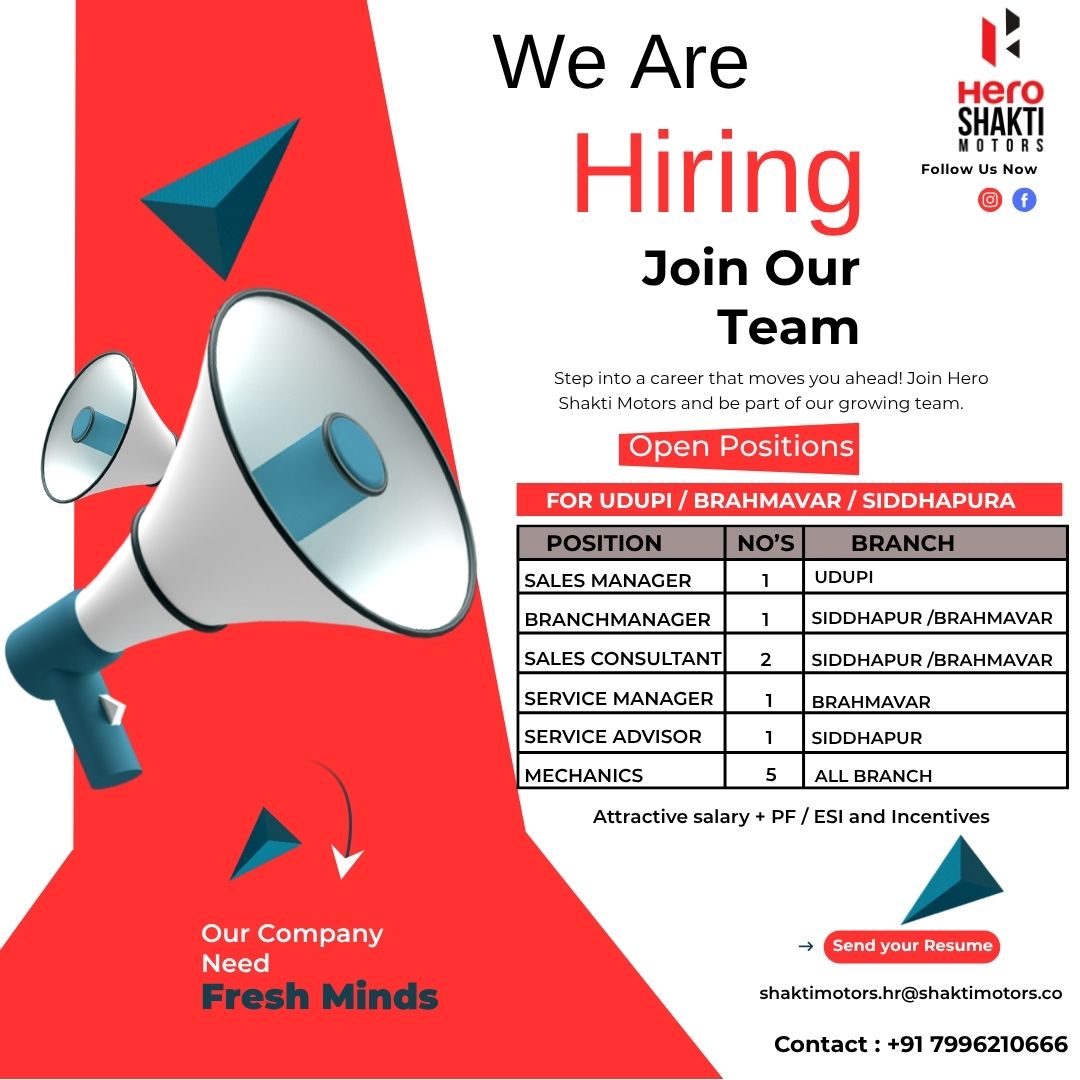 ಉಡುಪಿ:ಉಡುಪಿ,ಬ್ರಹ್ಮಾವರ,ಸಿದ್ಧಾಪುರ ದ ಹೀರೋಶಕ್ತಿ ಮೋಟಾರ್ಸ್ ನಲ್ಲಿ ವಿವಿಧ ಹುದ್ದೆಗಳಿಗೆ ನೇಮಕಾತಿ ನಡೆಯಲಿದೆ.