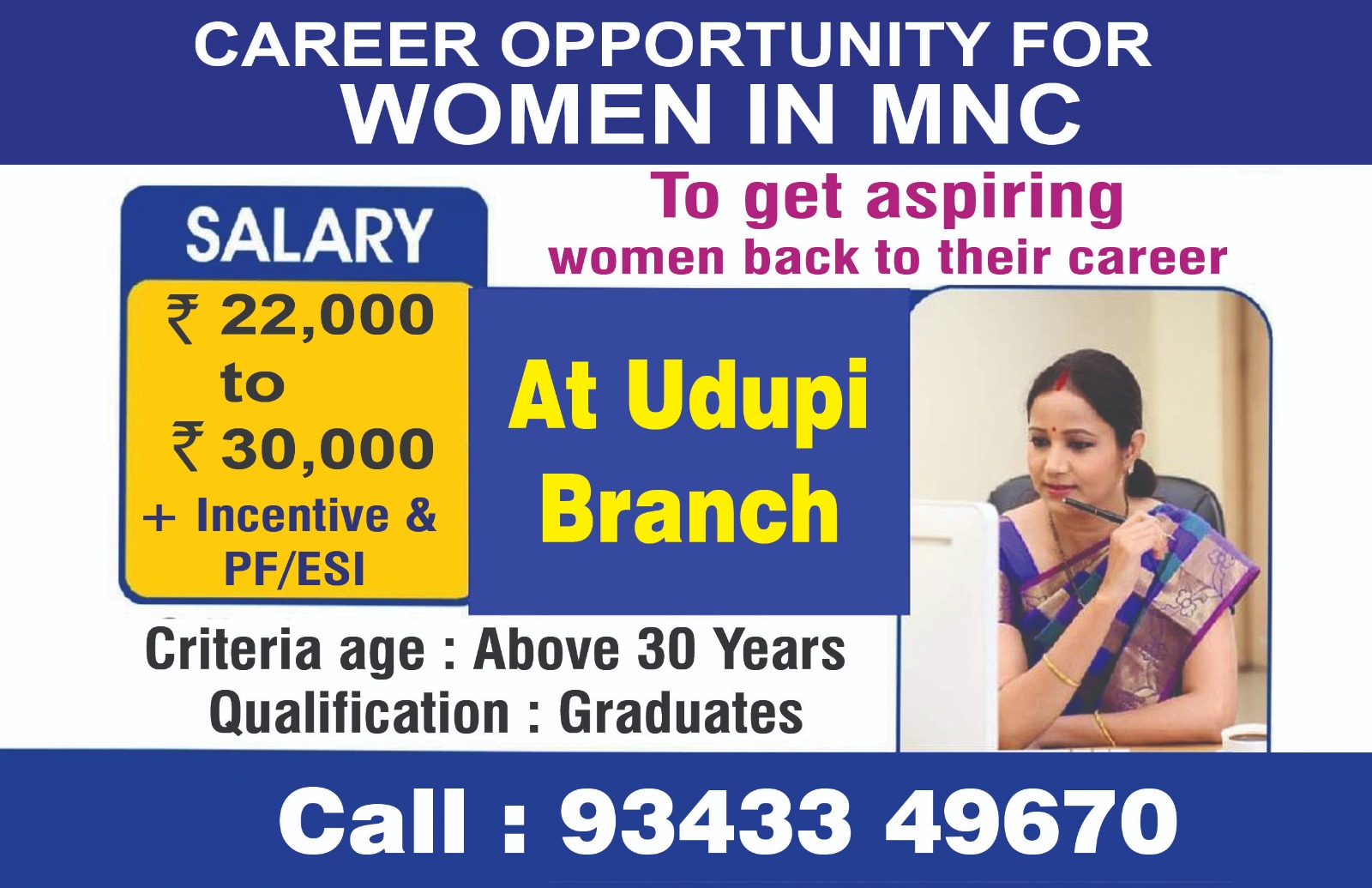 ಉಡುಪಿ: ಮಹಿಳೆಯರಿಗೆ ಉಡುಪಿಯಲ್ಲಿ ಕೆಲಸ ಮಾಡಲು ಒಂದು ಸುವರ್ಣ ಅವಕಾಶ. ಉಡುಪಿ MNC ಗೆ ಡಿಗ್ರಿ ಆಗಿರುವ 30 ವರ್ಷ ಮೇಲ್ಪಟ್ಟ ಮಹಿಳೆಯರು ಬೇಕಾಗಿದ್ದಾರೆ.