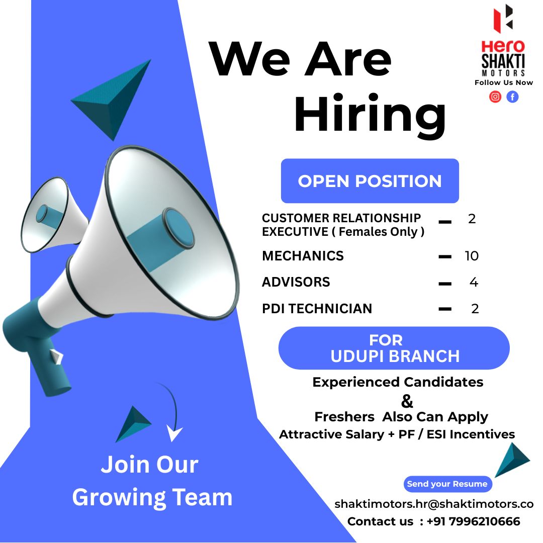 ಉಡುಪಿ: ಹೀರೋ ಶಕ್ತಿ ಮೋಟರ್ಸ್‌ನಲ್ಲಿ ಉದ್ಯೋಗಾವಕಾಶ