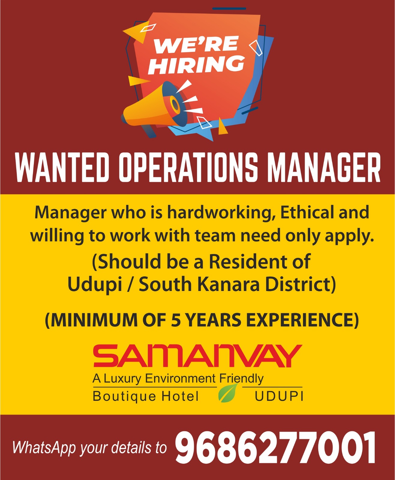 ಉಡುಪಿ:ಉಡುಪಿಯ ಸಮನ್ವಯ್ (Samanvay) – ಲಕ್ಸುರಿ ಎನ್ವಿರಾನ್ಮೆಂಟ್ ಫ್ರೆಂಡ್ಲಿ ಬೂಟಿಕ್ ಹೋಟೆಲ್ನಲ್ಲಿ ಆಪರೇಷನ್ಸ್ ಮ್ಯಾನೇಜರ್ ಹುದ್ದೆಗೆ ಅರ್ಜಿ ಆಹ್ವಾನಿಸಲಾಗಿದೆ.